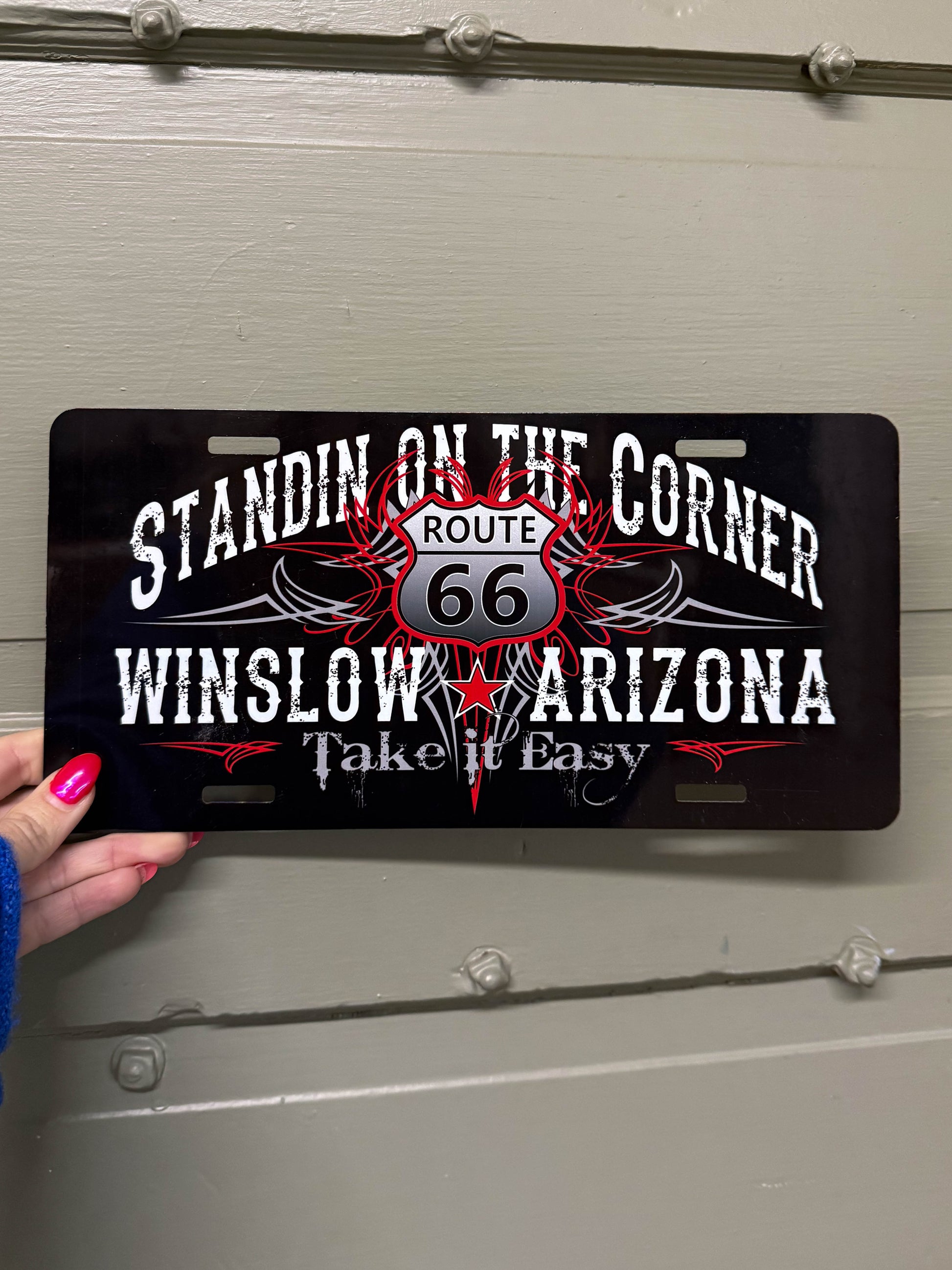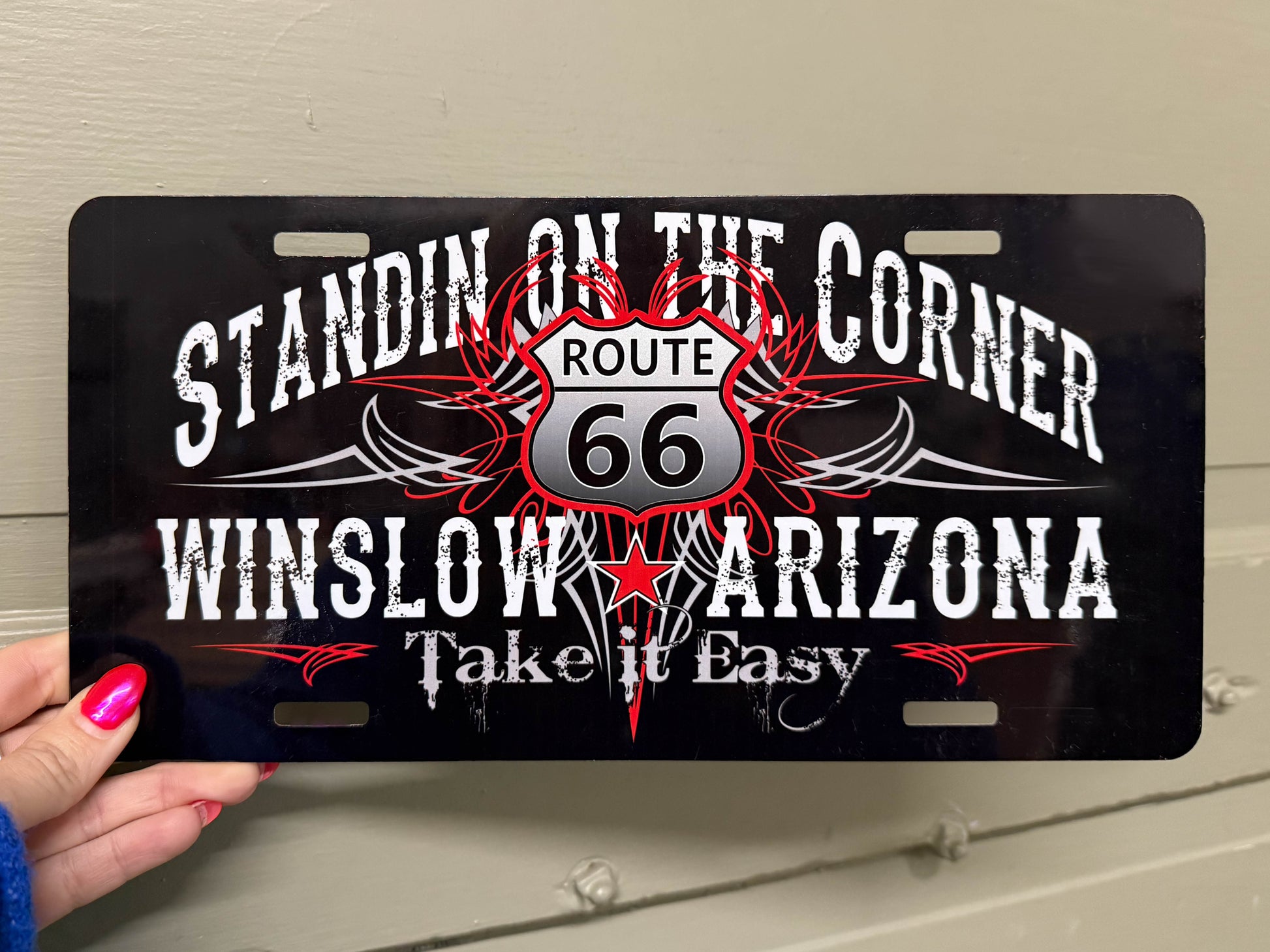 This license plate is a tribute to the worldwide phenomenon song Take it Easy by the Eagles, and our stop to honor it in Winslow, Arizona. This is a great way to commemorate your time visiting our beautiful town and love for the Eagles!