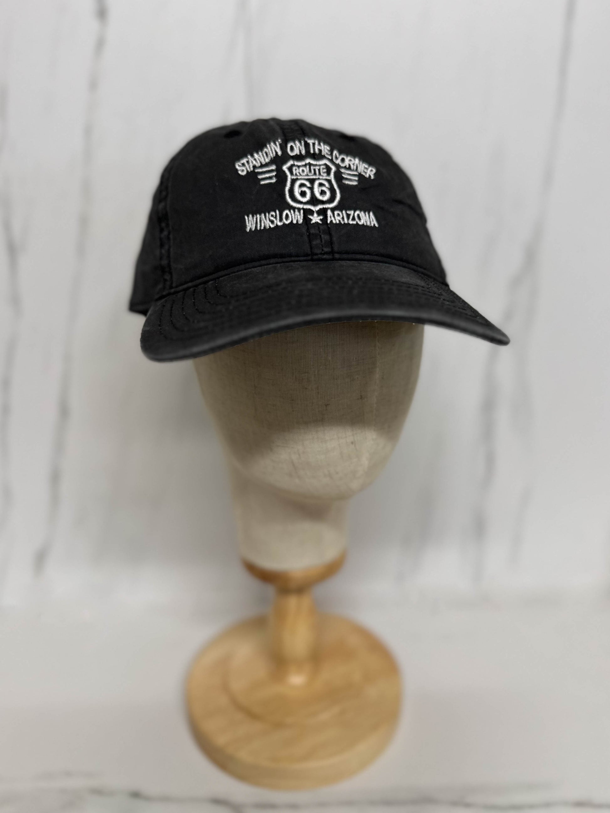Adjustable, one size fits most, charcoal gray dad-cap with the Standin' On the Corner phrase, Route 66 shield, and Winslow * Arizona embroidered on the front. The perfect go-to cap for everyday life!