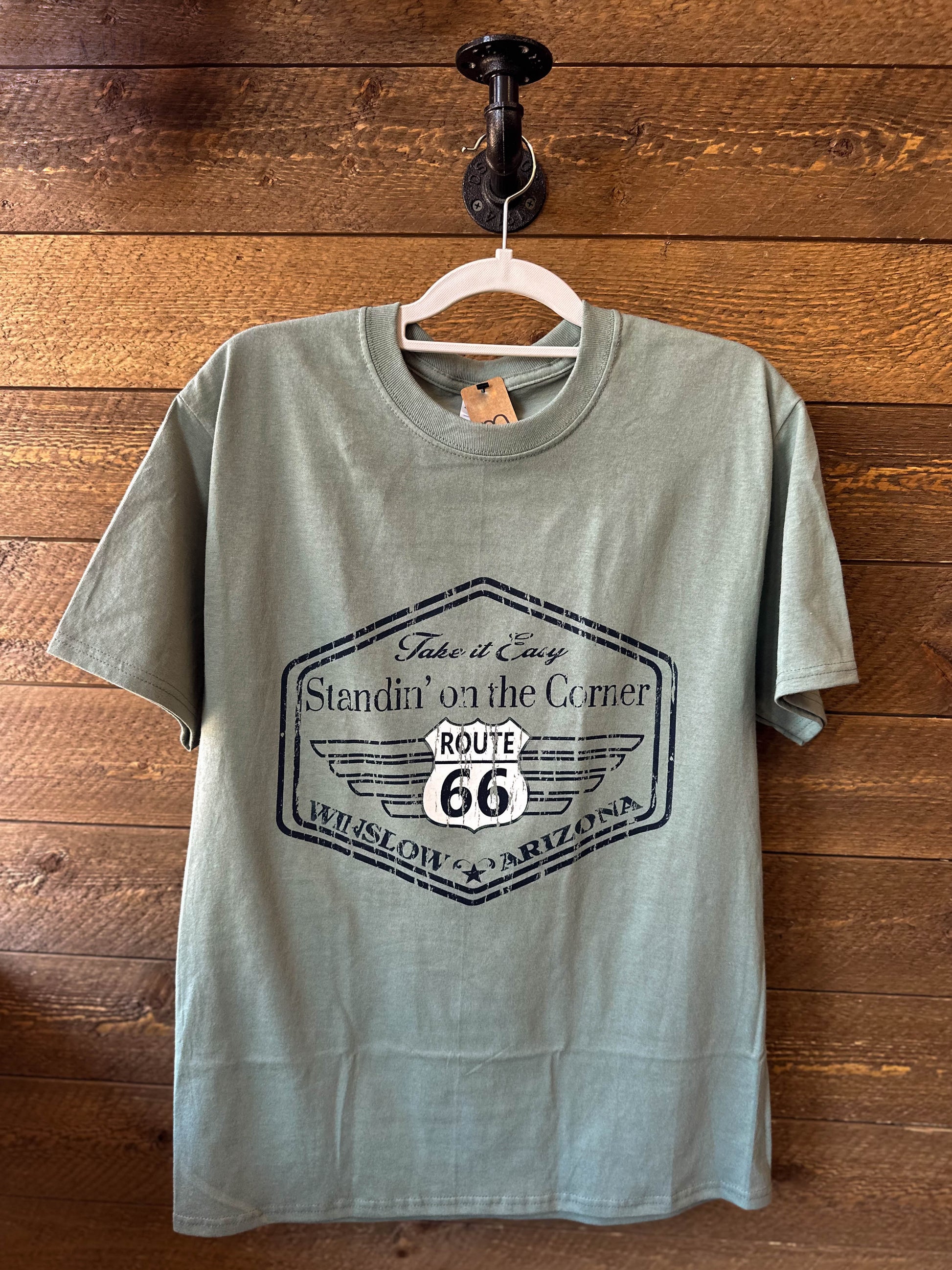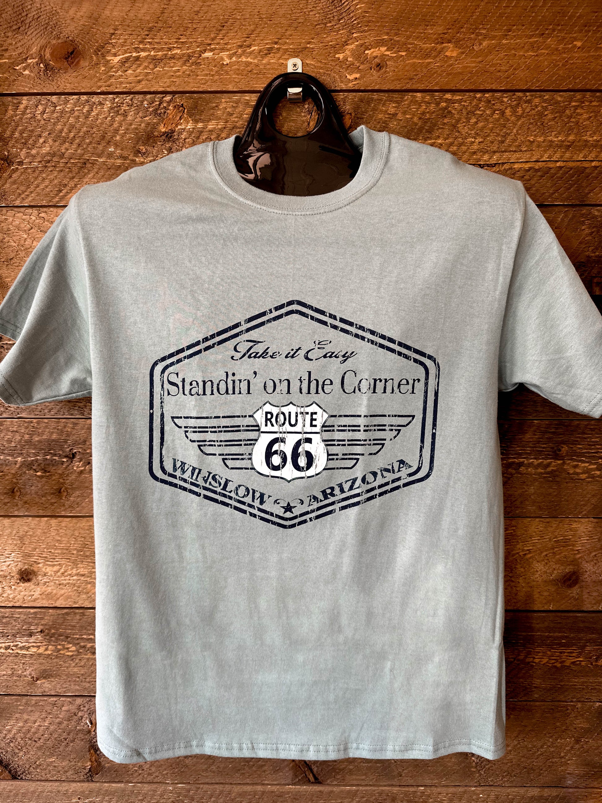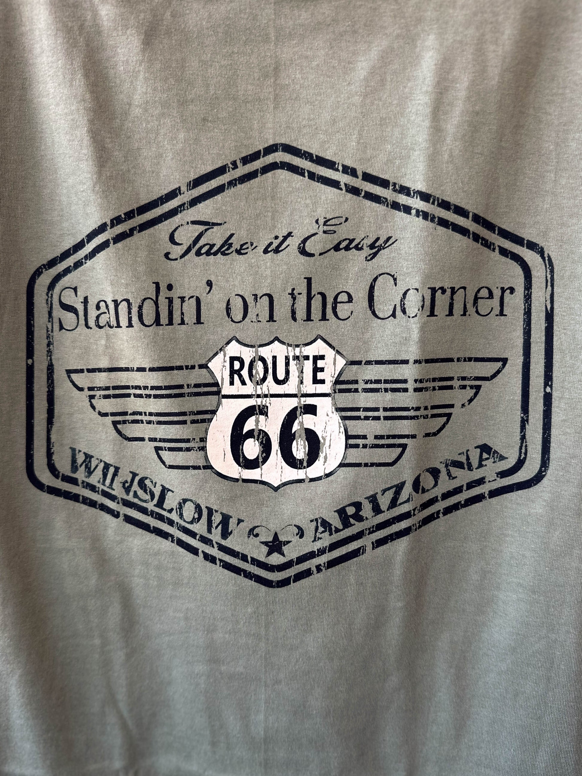 This tee is the perfect simple solution to help you remember and reminisce on your time visiting the corner! With the chevron design encapsulating the "Take it Easy", "Standin' On the Corner", "Winslow * Arizona". with the Route 66 Shield inside. It's green with a navy print, and a customer favorite! We also has it in very inclusive sizes.
