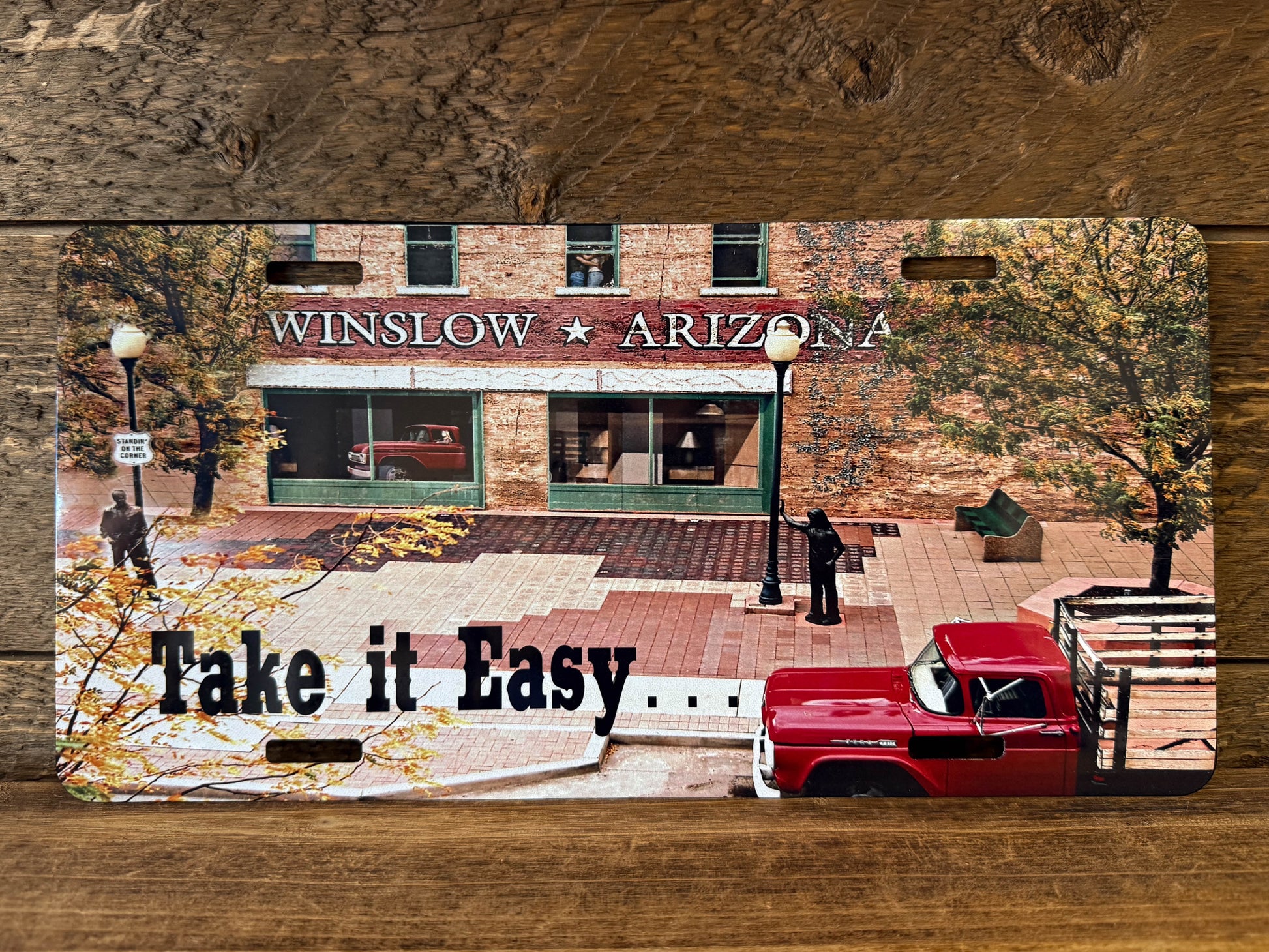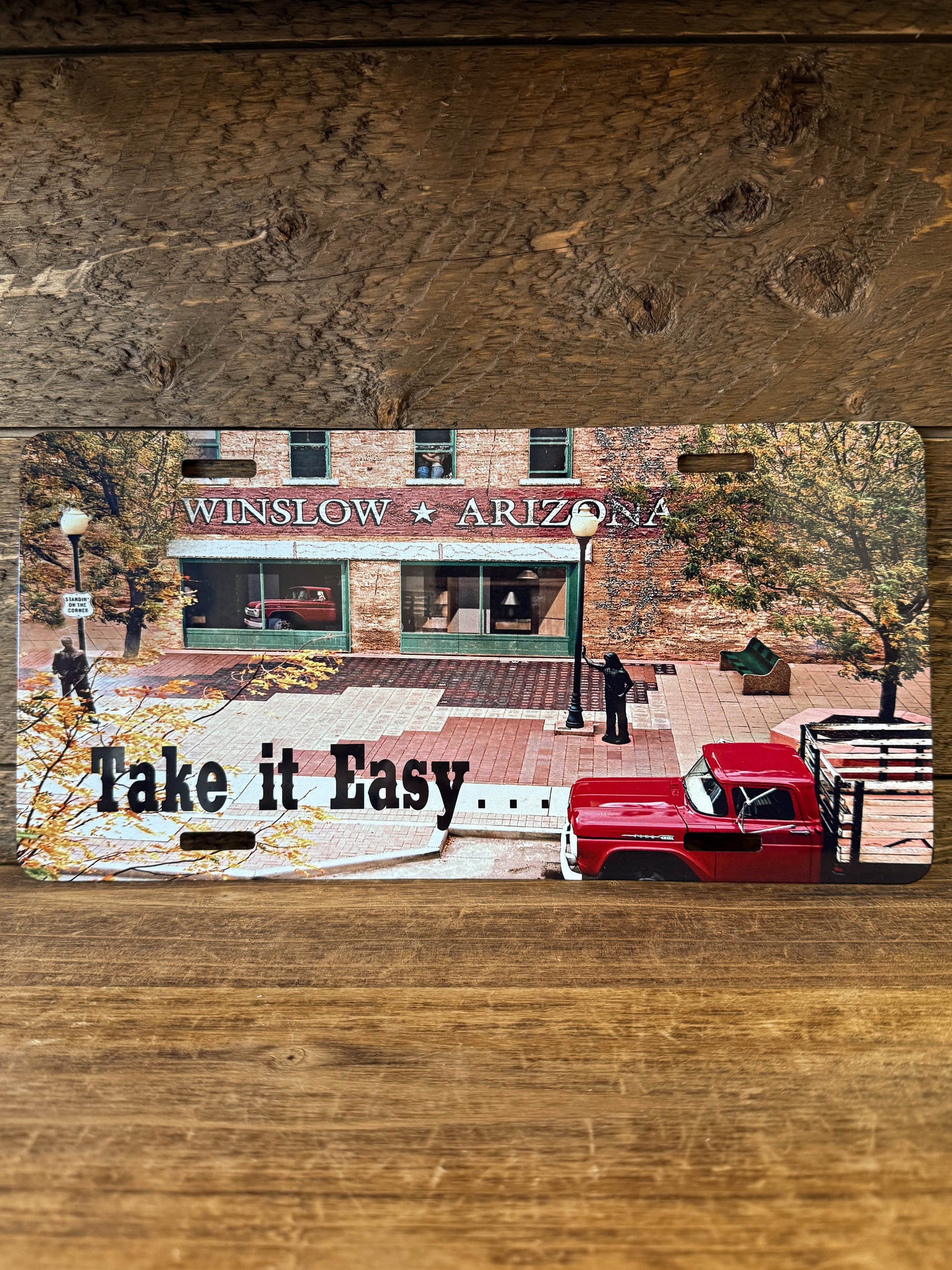 This license plate shows the flatbed Ford, along with the famous spot on our favorite corner in Winslow, Arizona. This is a great way to commemorate your time visiting our beautiful town and love for the Eagles!