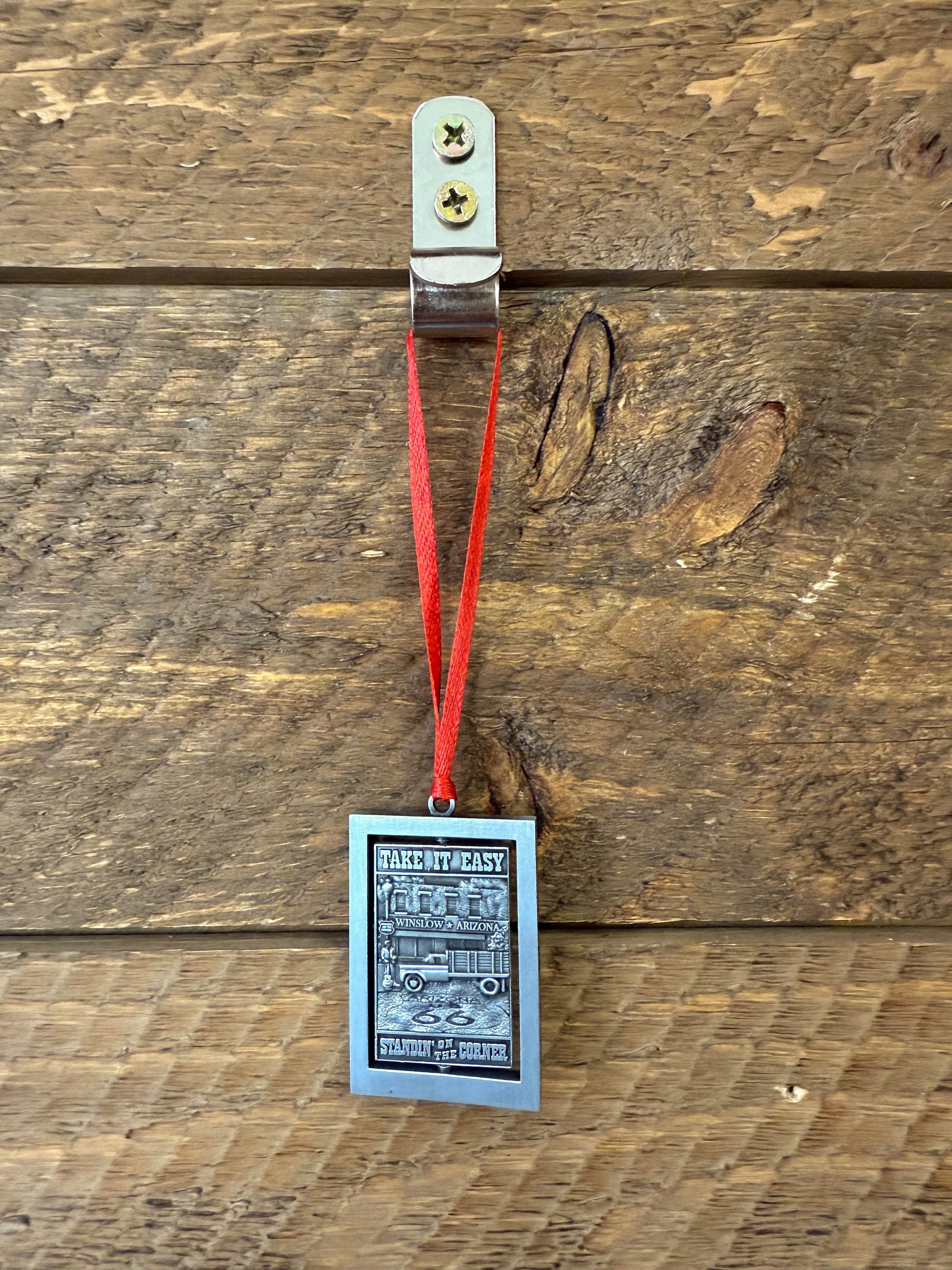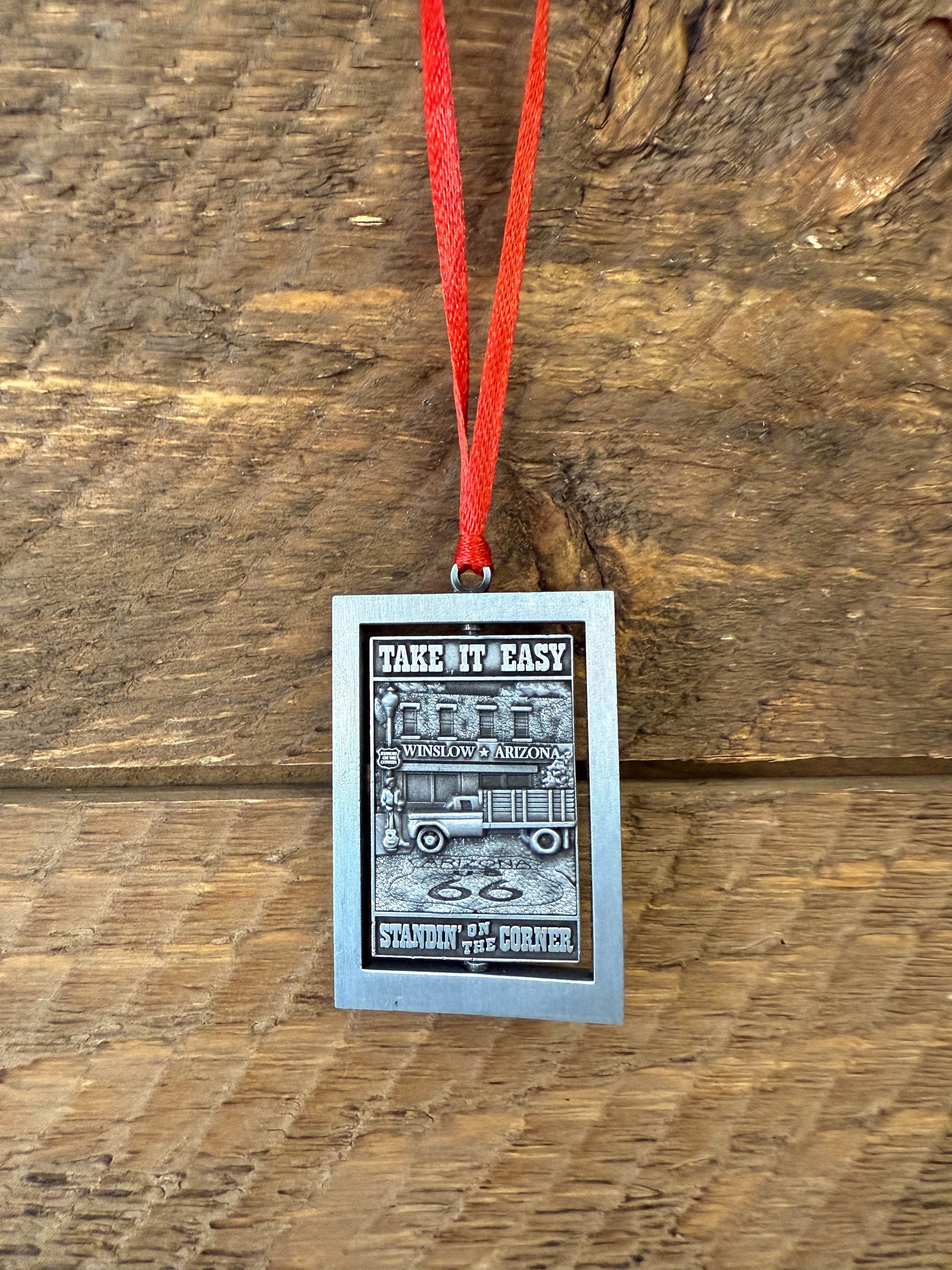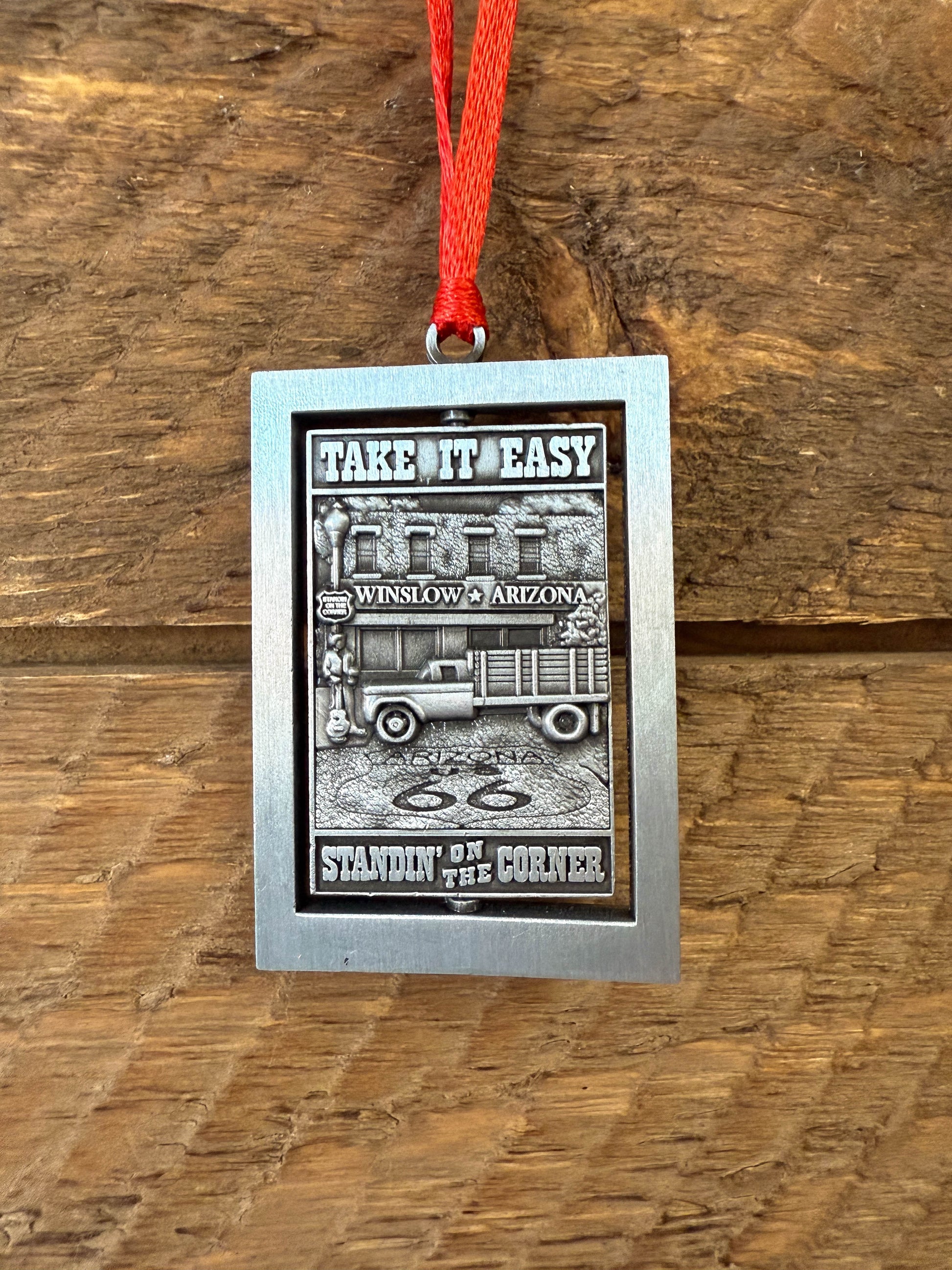 Route 66 ornament made of metal and tied up with red ribbon. It makes the perfect gift or chance to reminisce on your time visiting America's Favorite Highway.