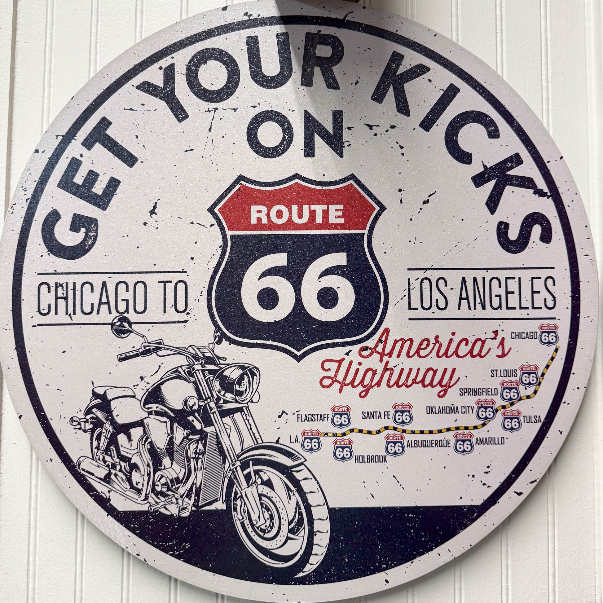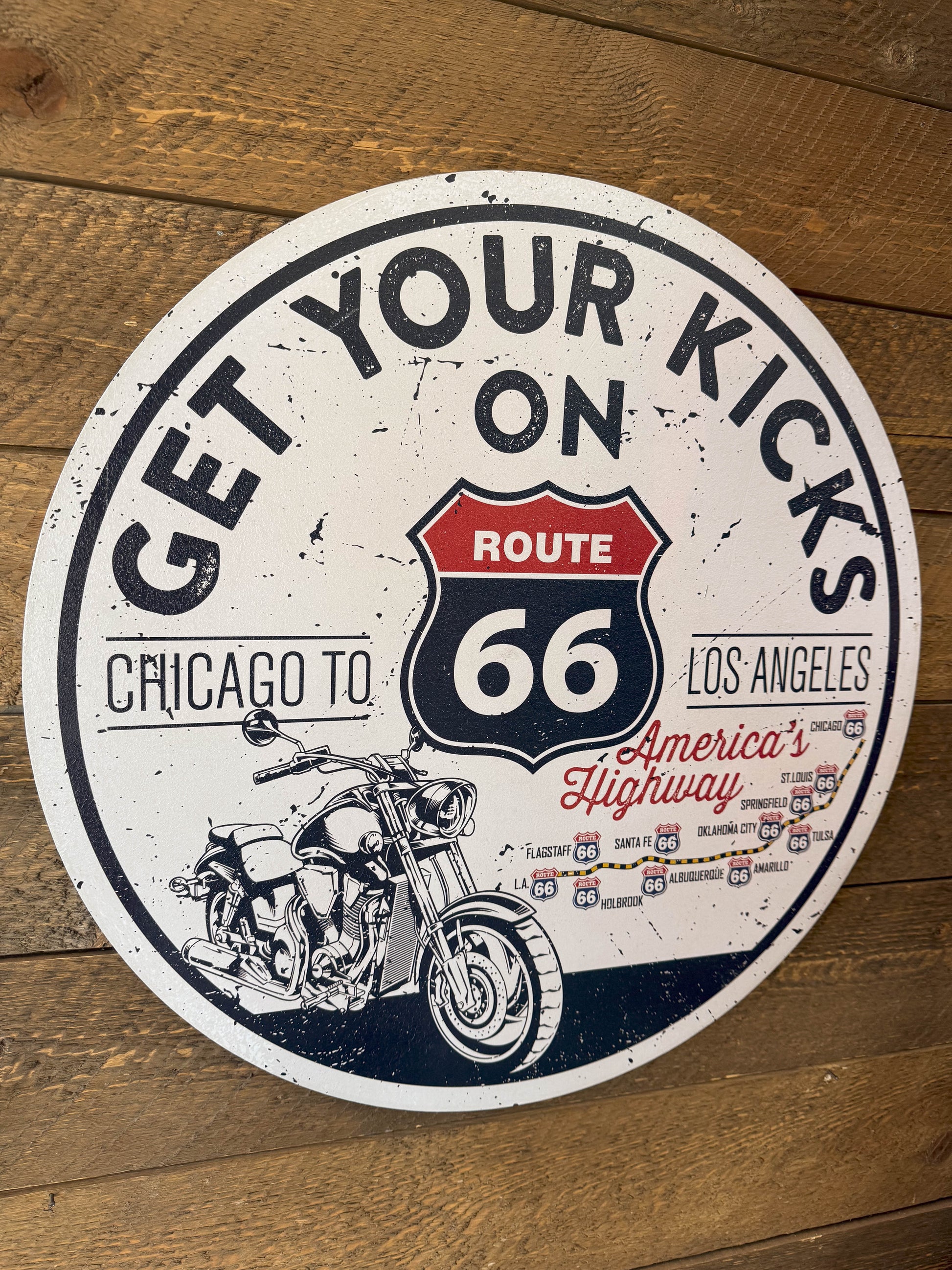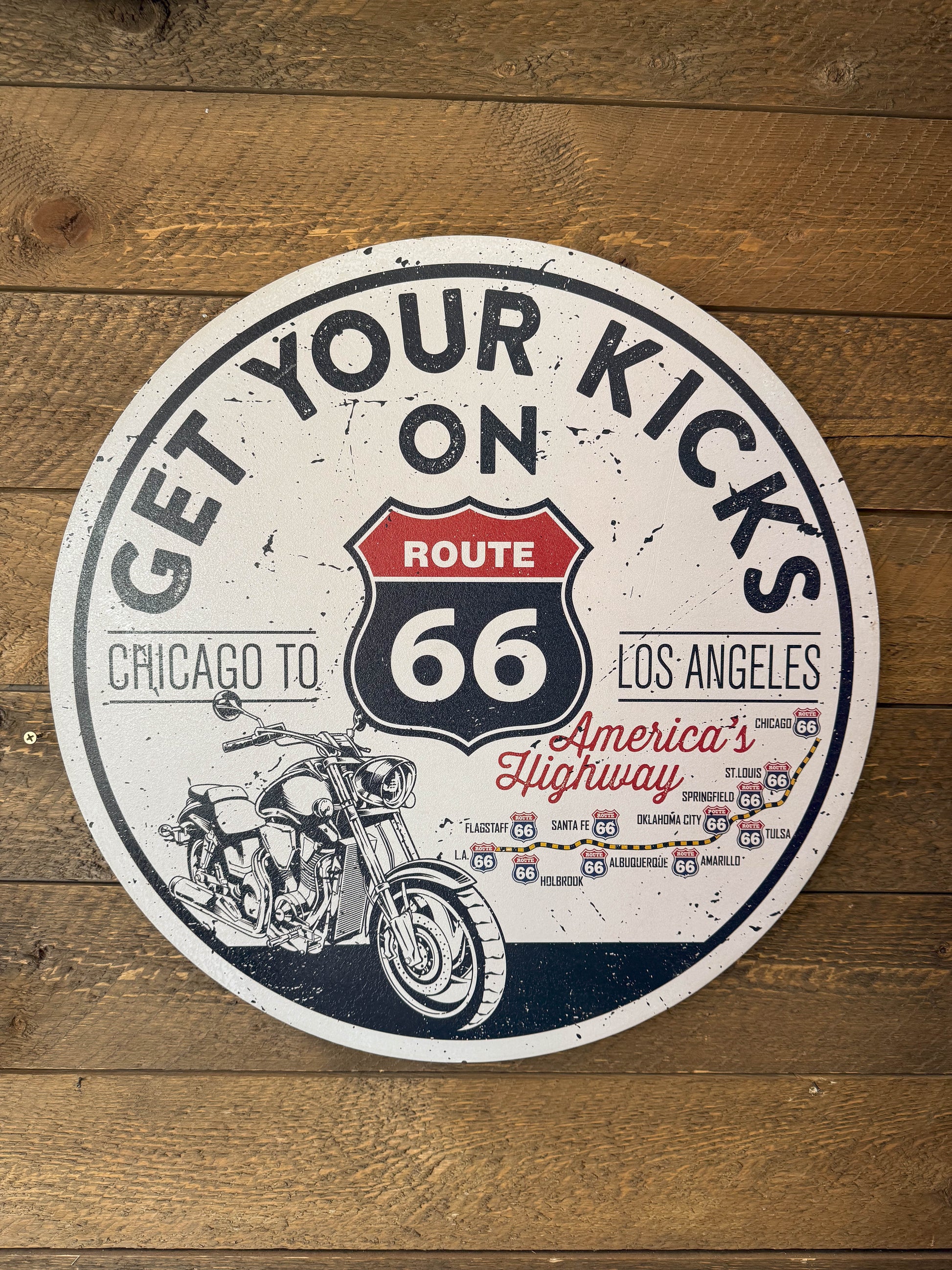 This sign is such a fun and cute way to remember your trip across America's favorite highway! It's red, white and blue, and 20" in diameter. It is heavy duty and solid all the way around.