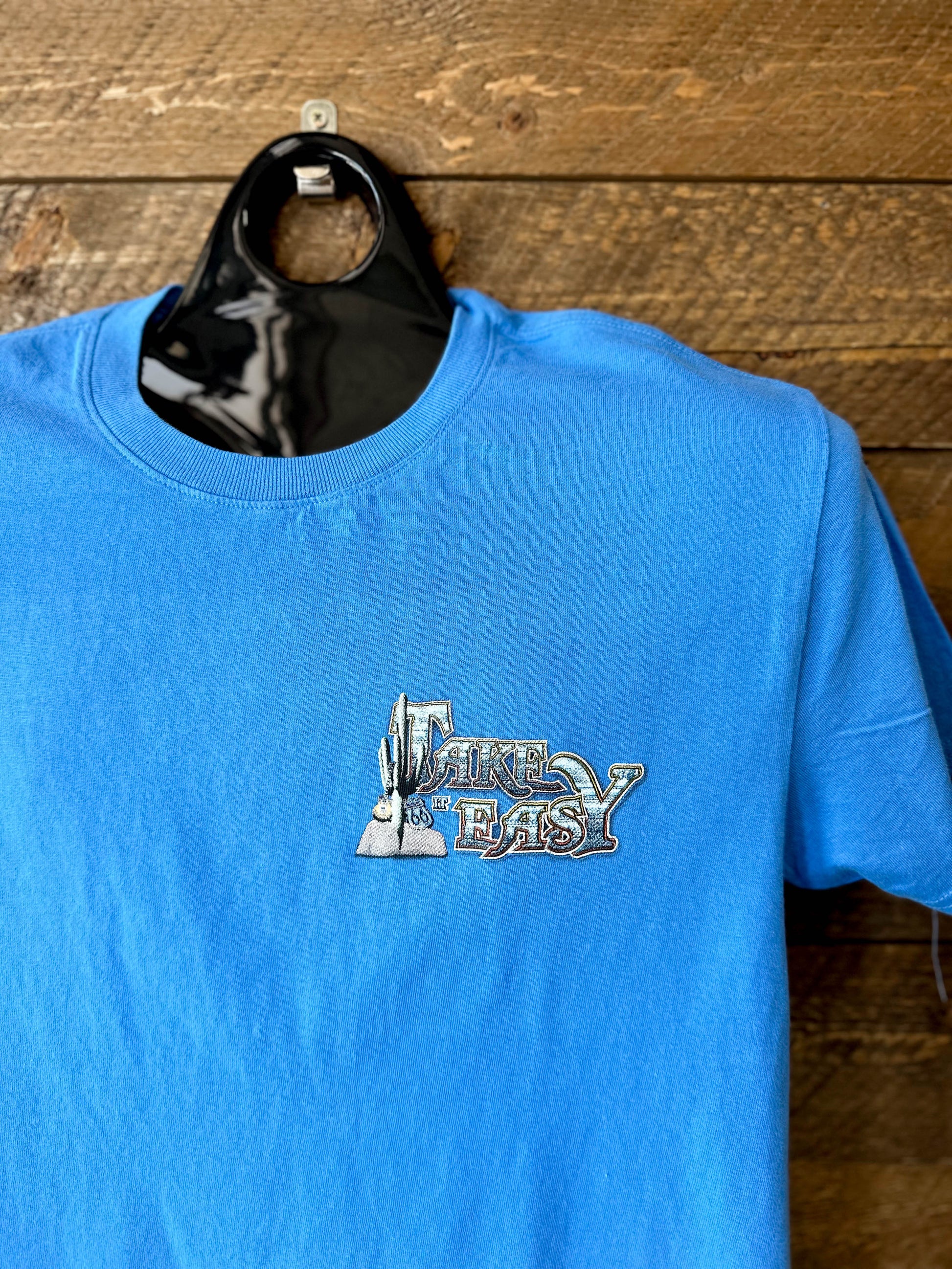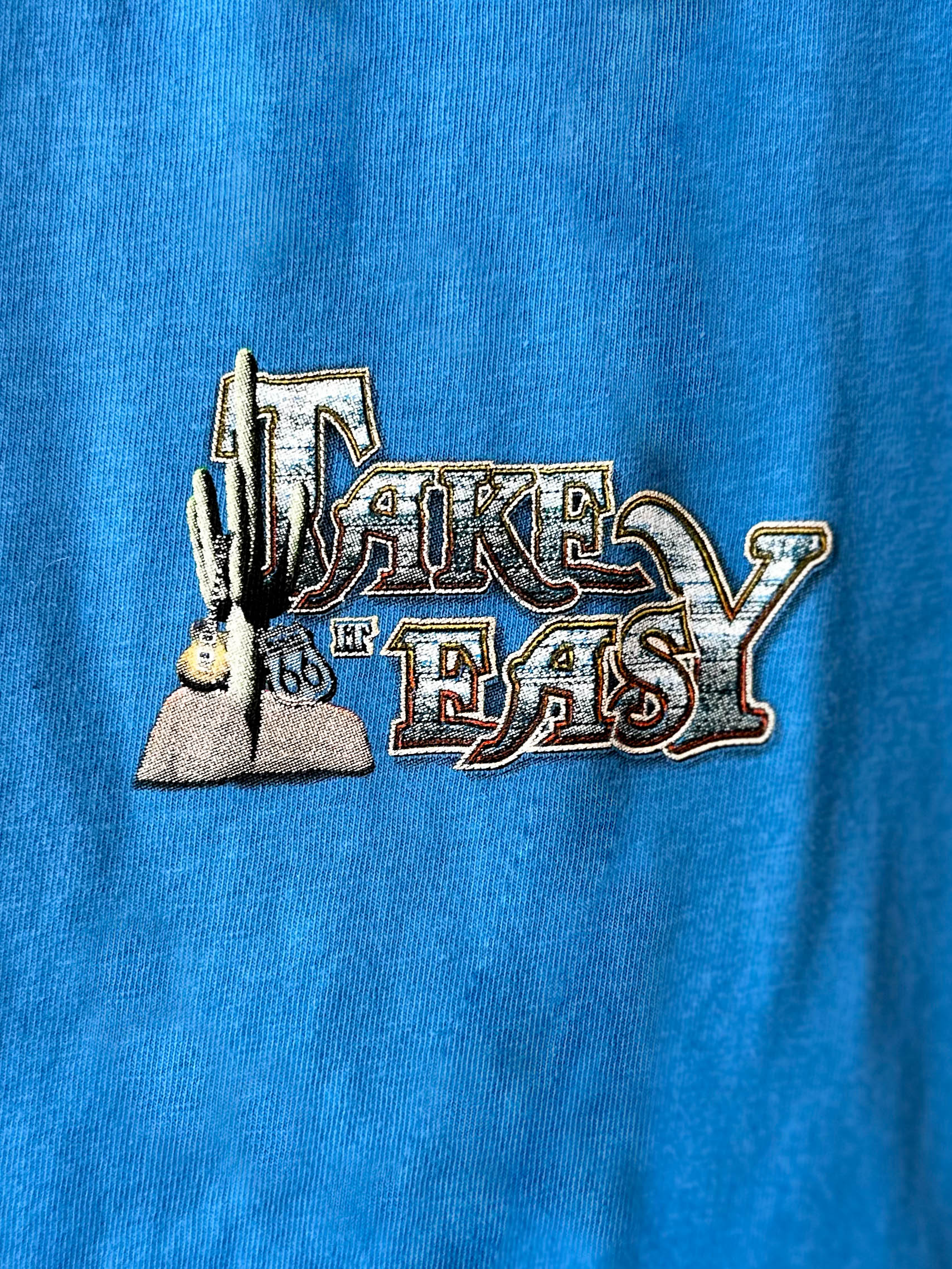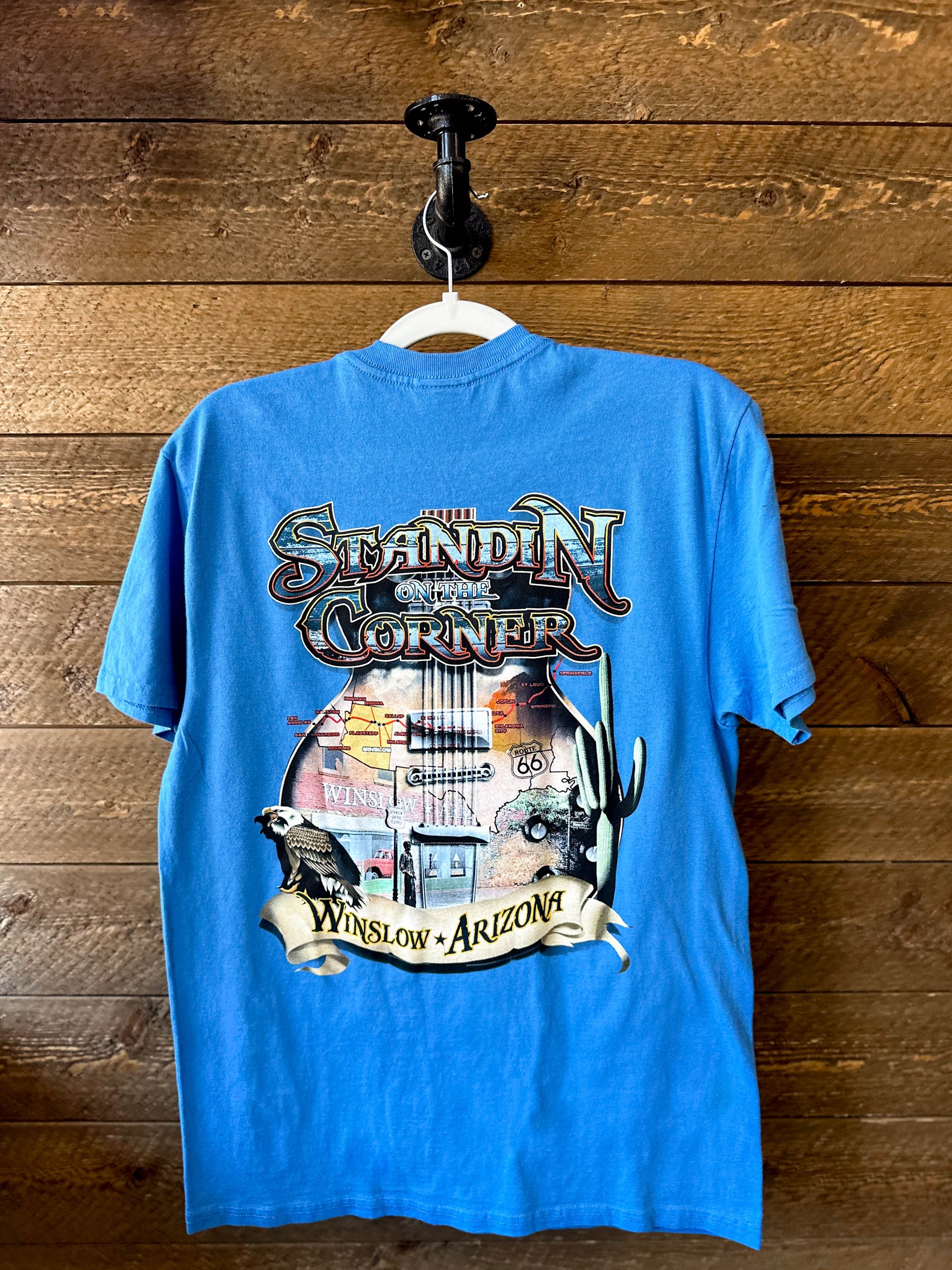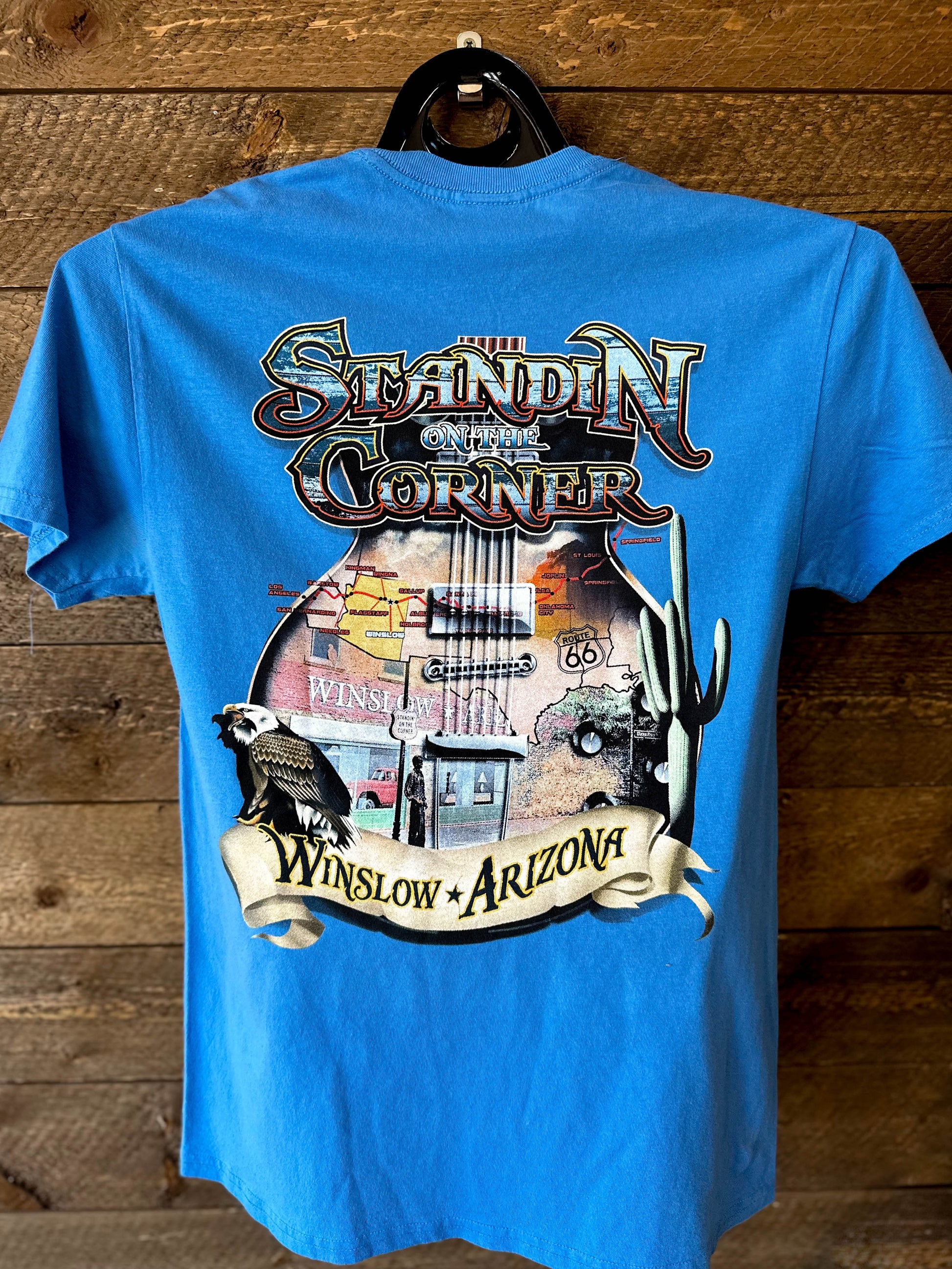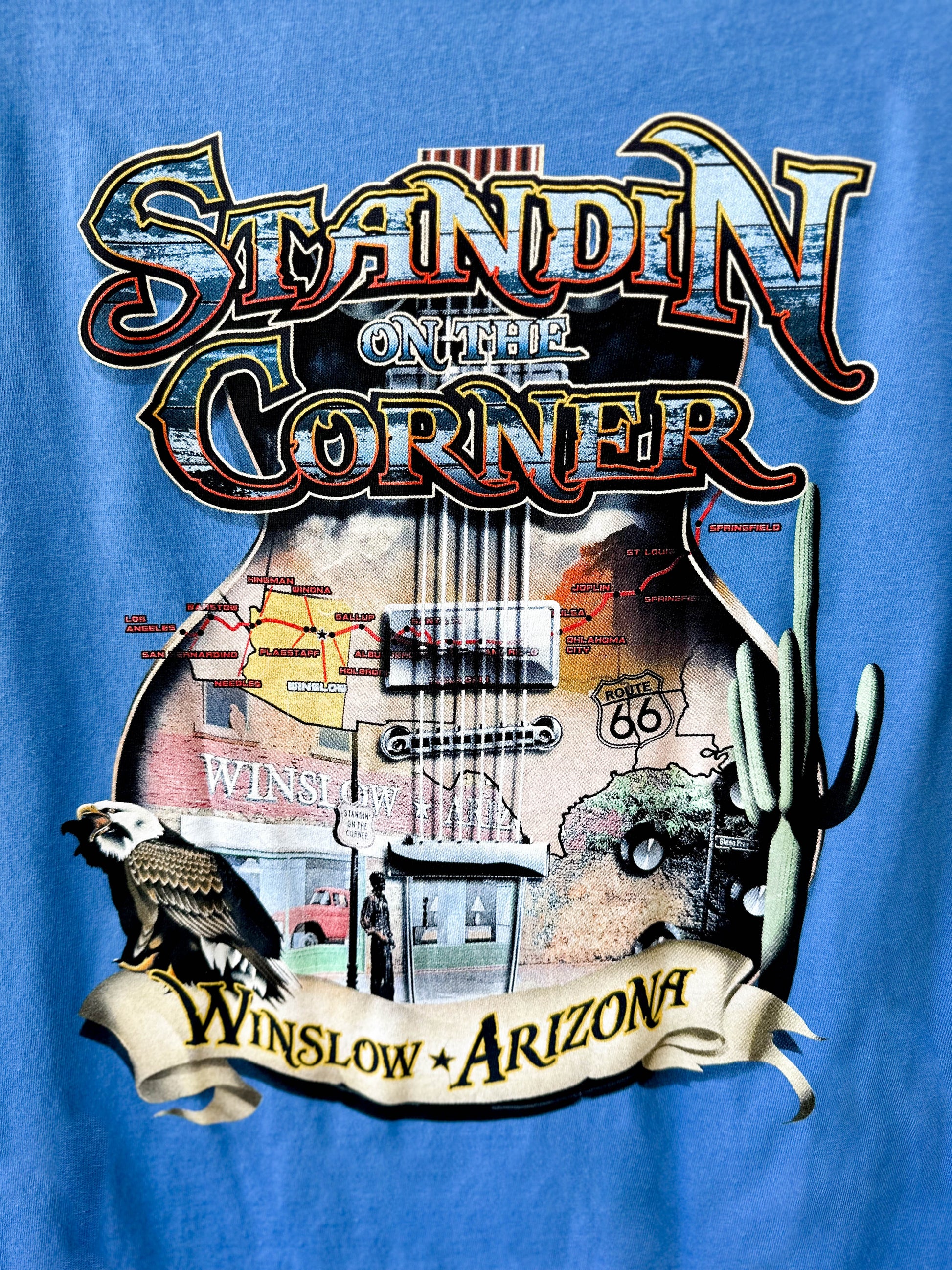 This tee has the absolute most neat design on both the front and back! it has an Arizona landscape design complete with cacti, bald eagles, an Arizona map, a photo of the corner and all the best phrases about Standin' On the Corner. We love this one!
