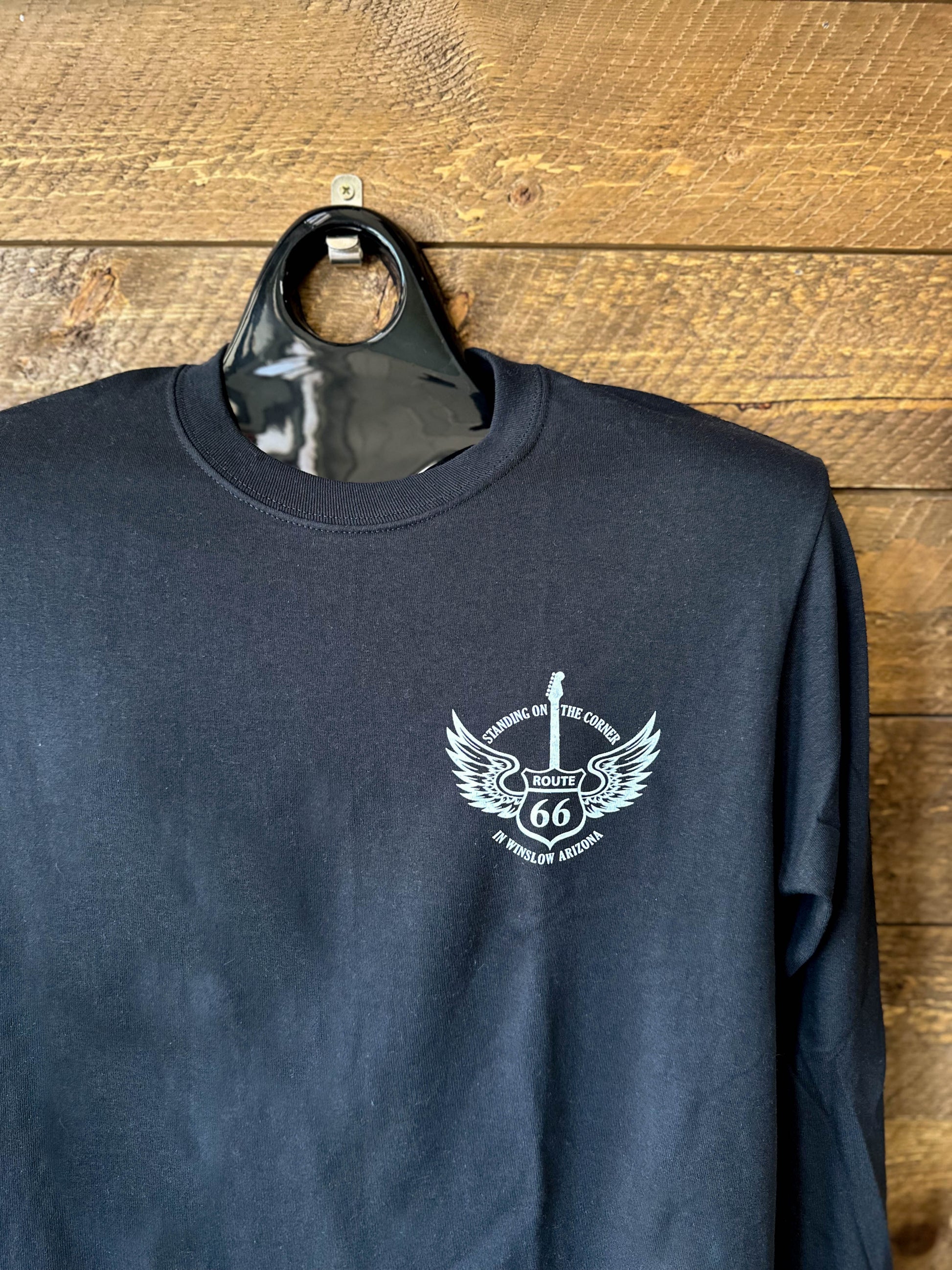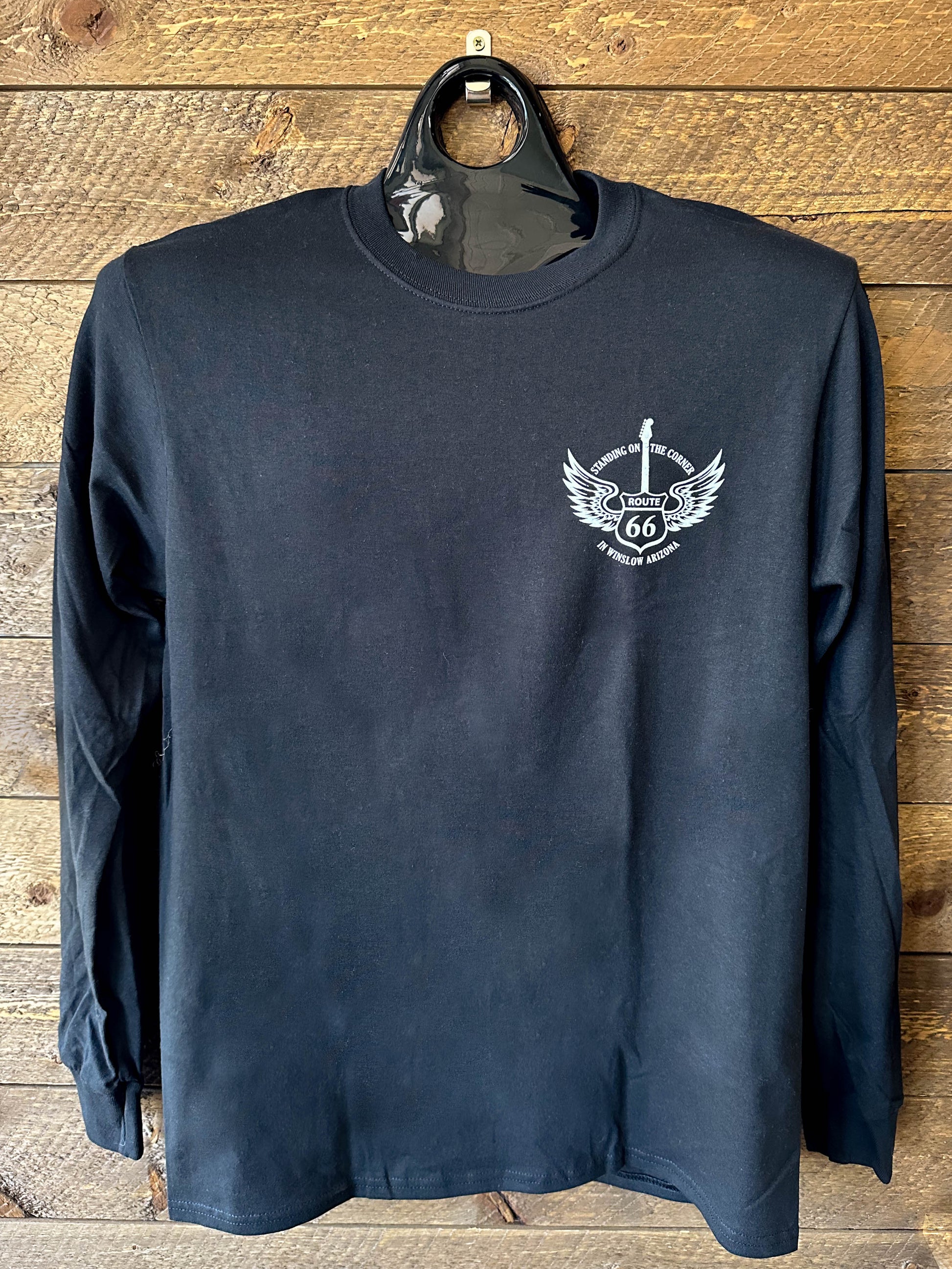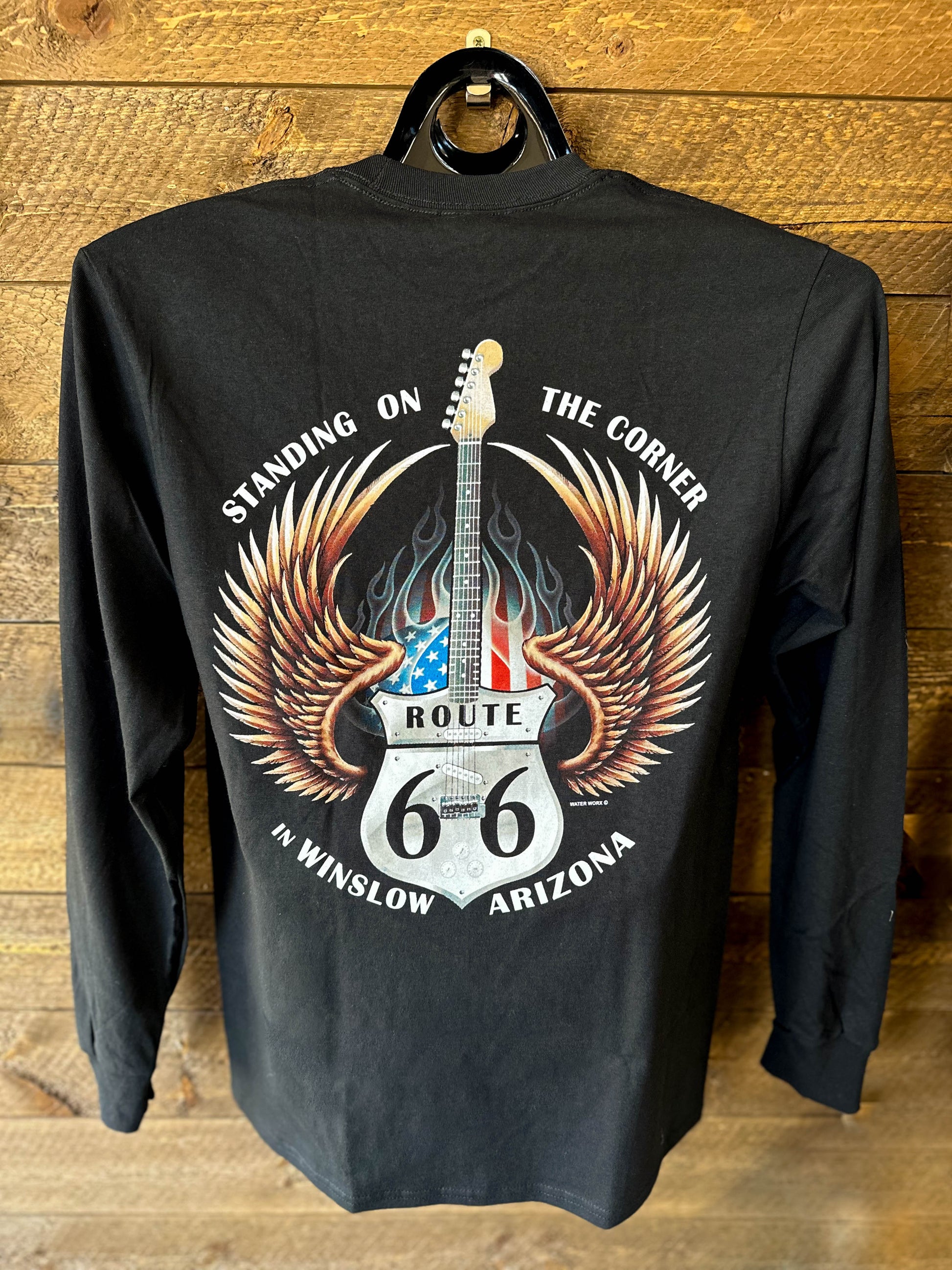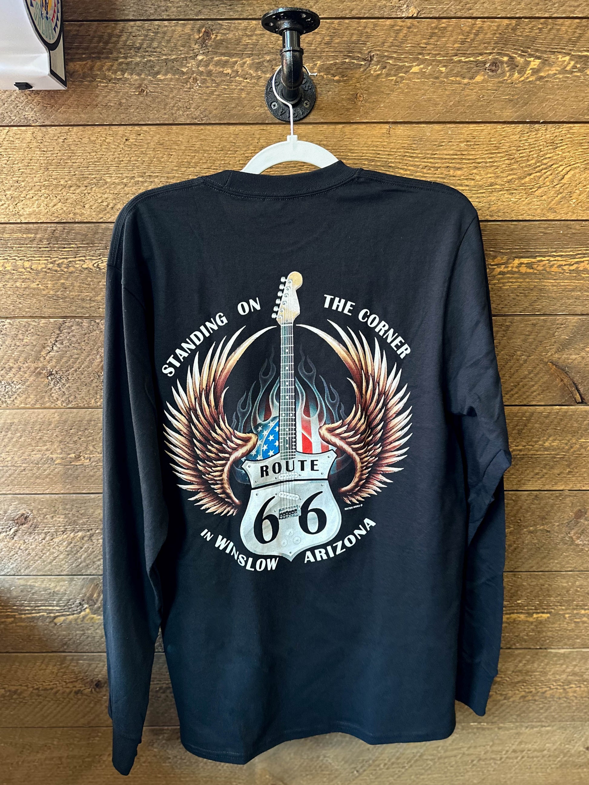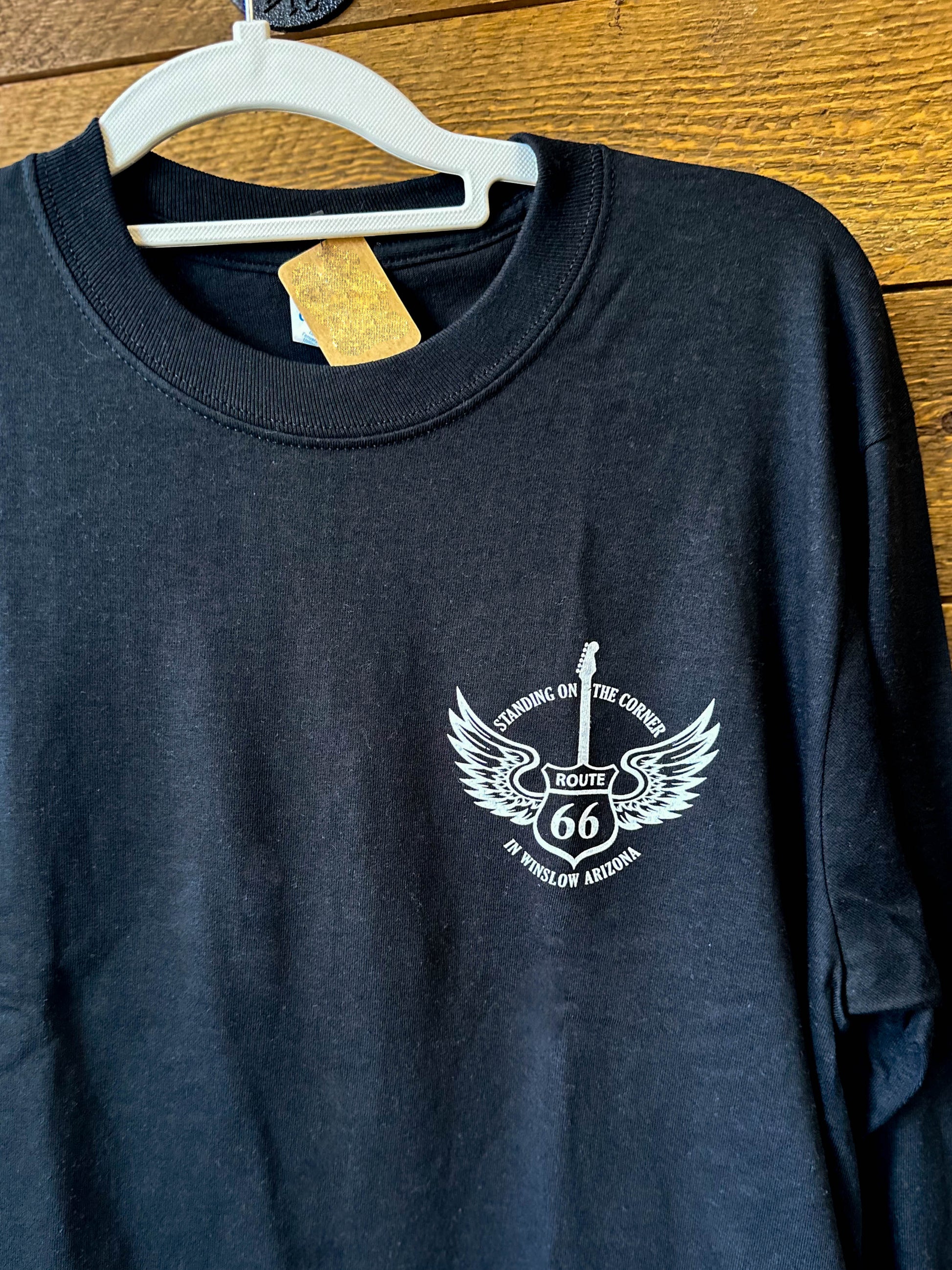 This tee is our original design done in house by the owner of our business. It's still our best seller to this day! The front says "Standin' on the corner in Winslow, Arizona" with the guitar wings design. The back is full of design and color, with a similar design but multi-colored with wings, flames, flag, shields... literally everything you could want in a Tee. We are obsessed!