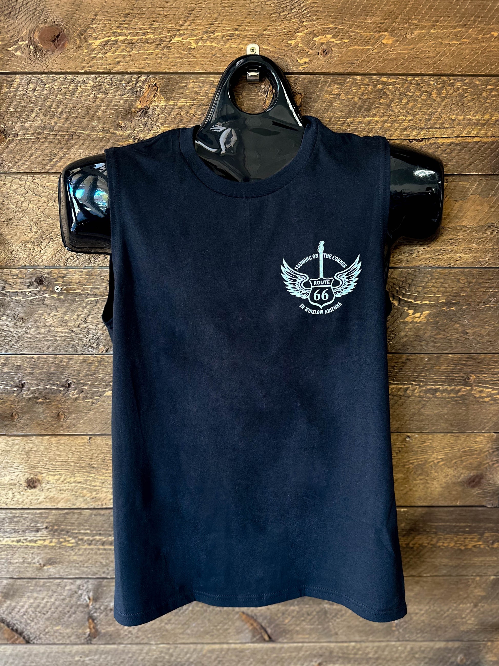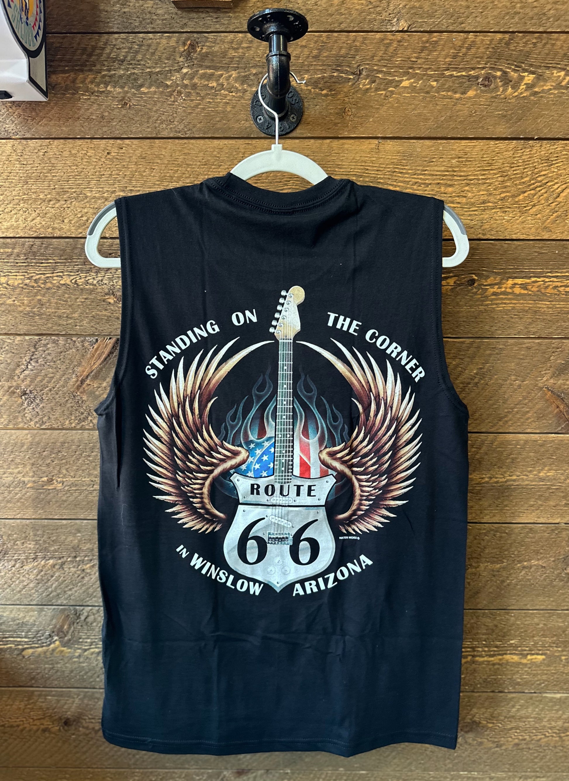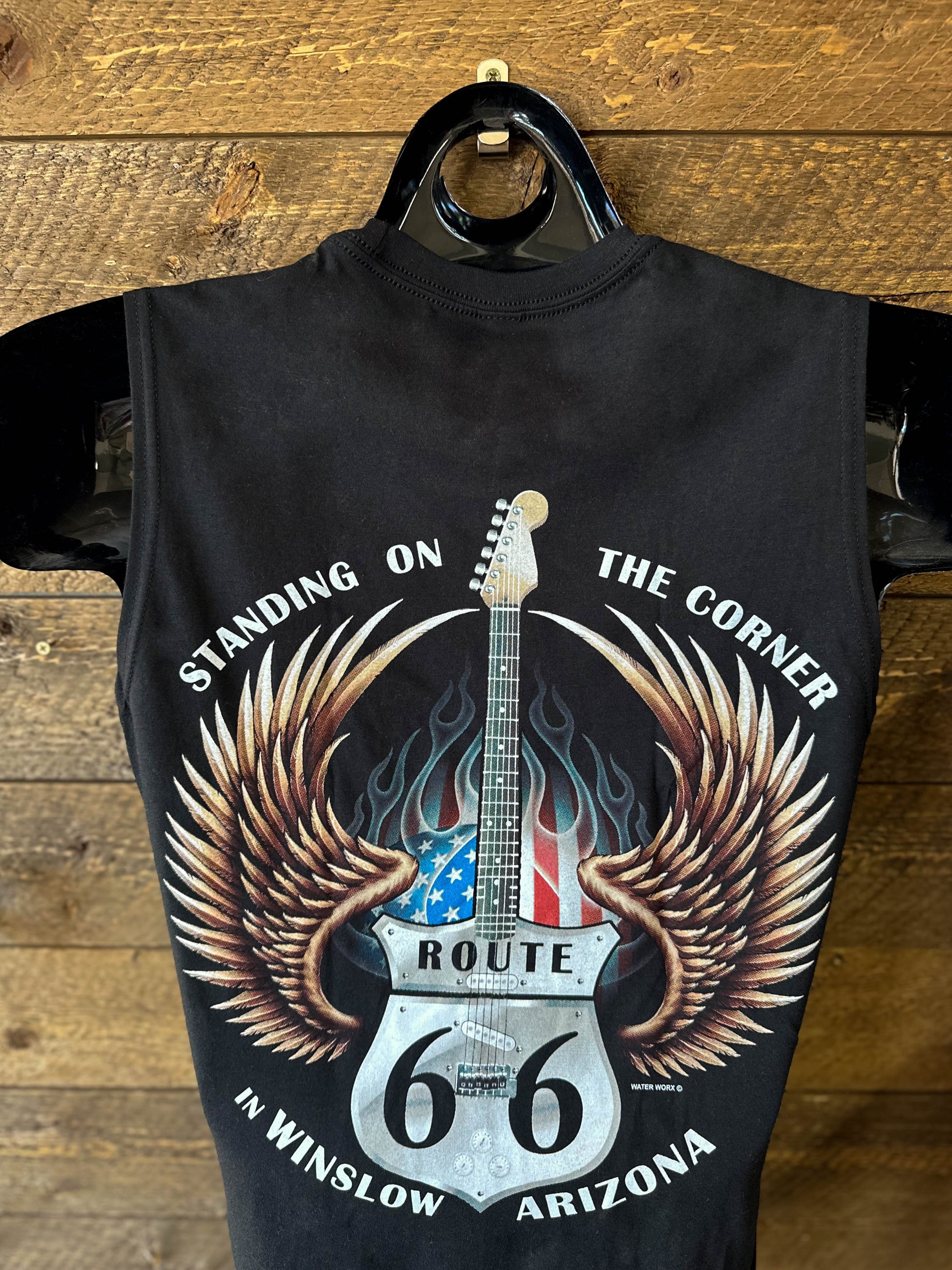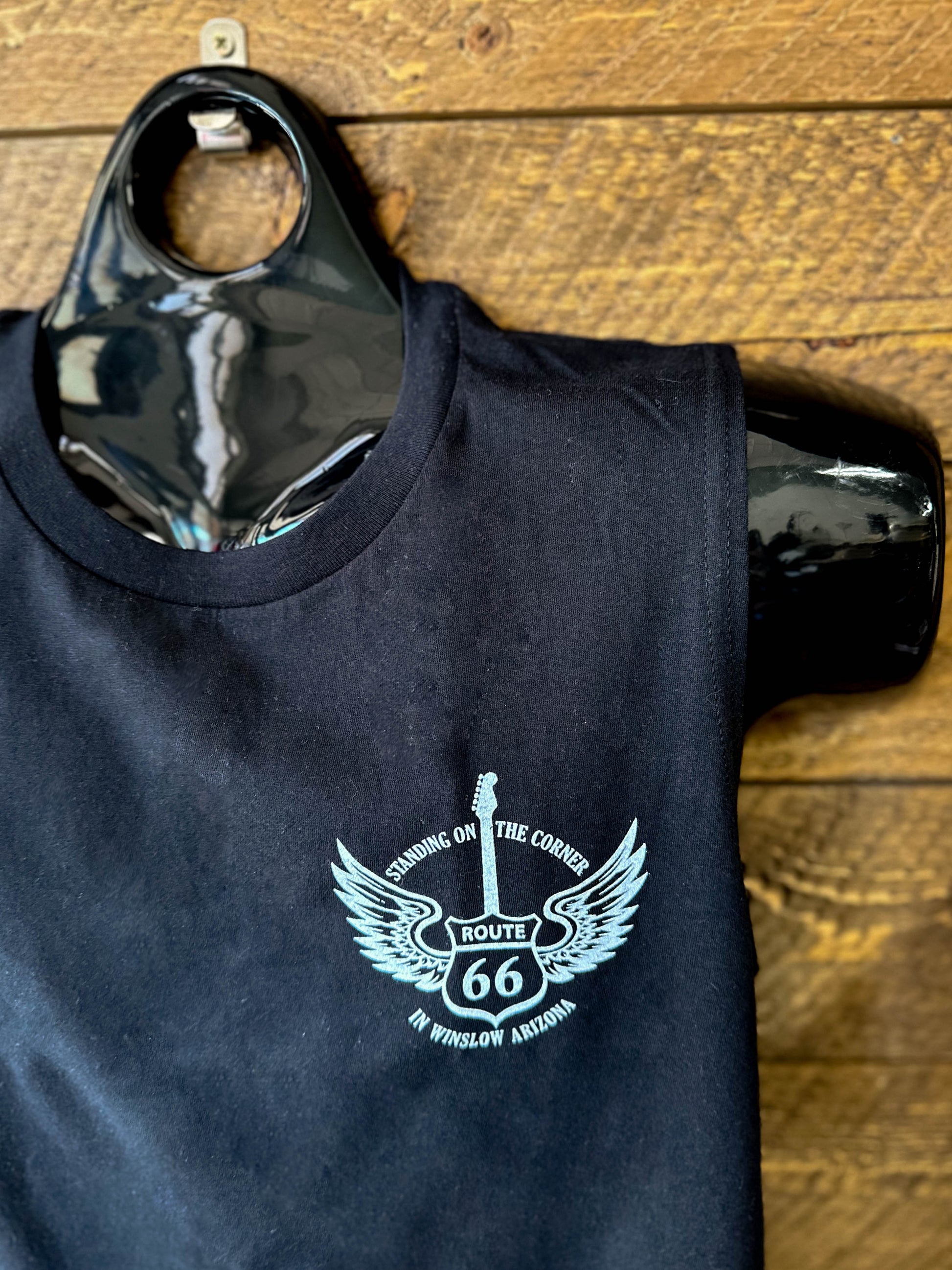 This tee is our original design done in house by the owner of our business. It's still our best seller to this day! The front says "Standin' on the corner in Winslow, Arizona" with the guitar wings design. The back is full of design and color, with a similar design but multi-colored with wings, flames, flag, shields... literally everything you could want in a Tee. We are obsessed!