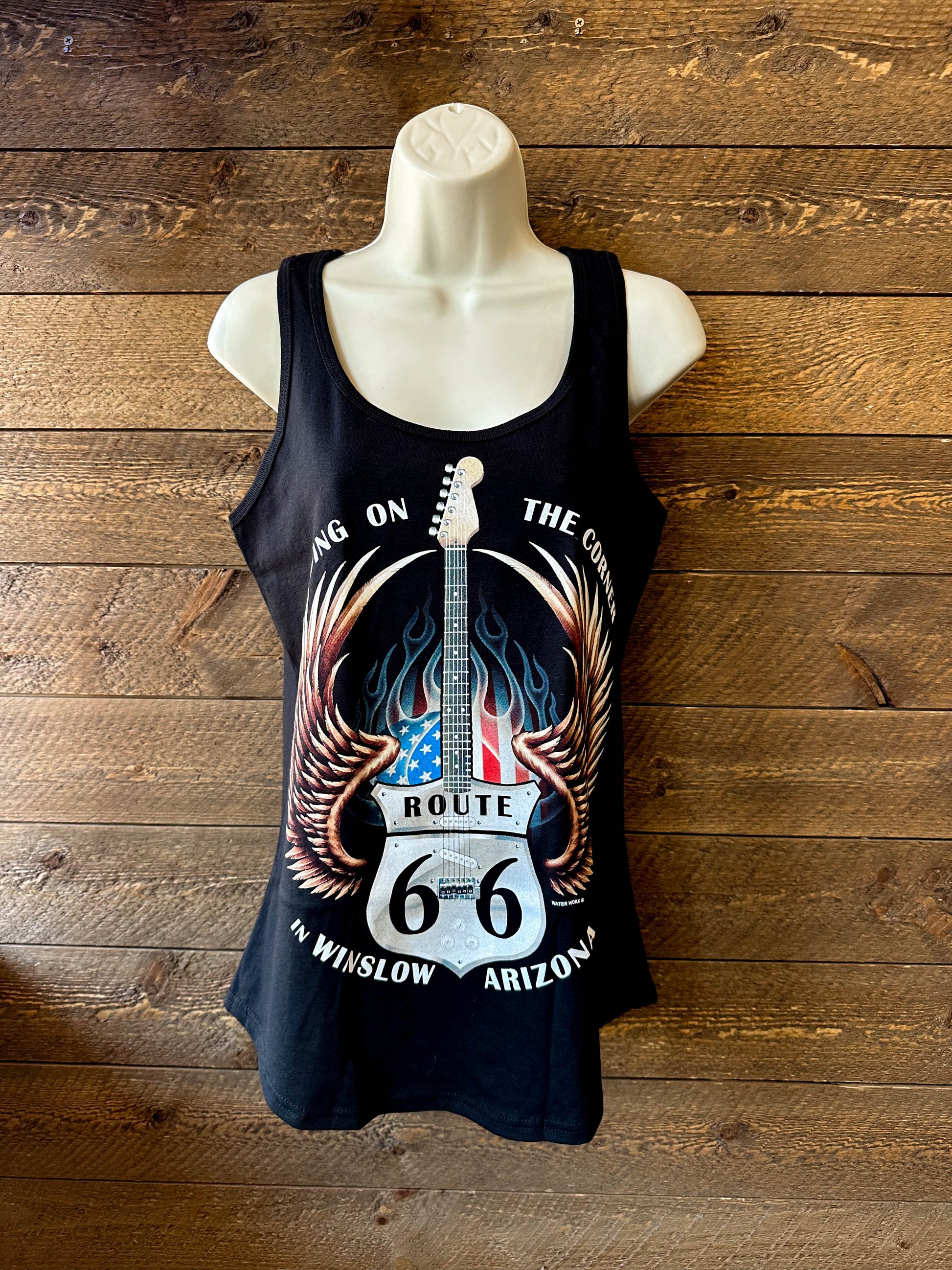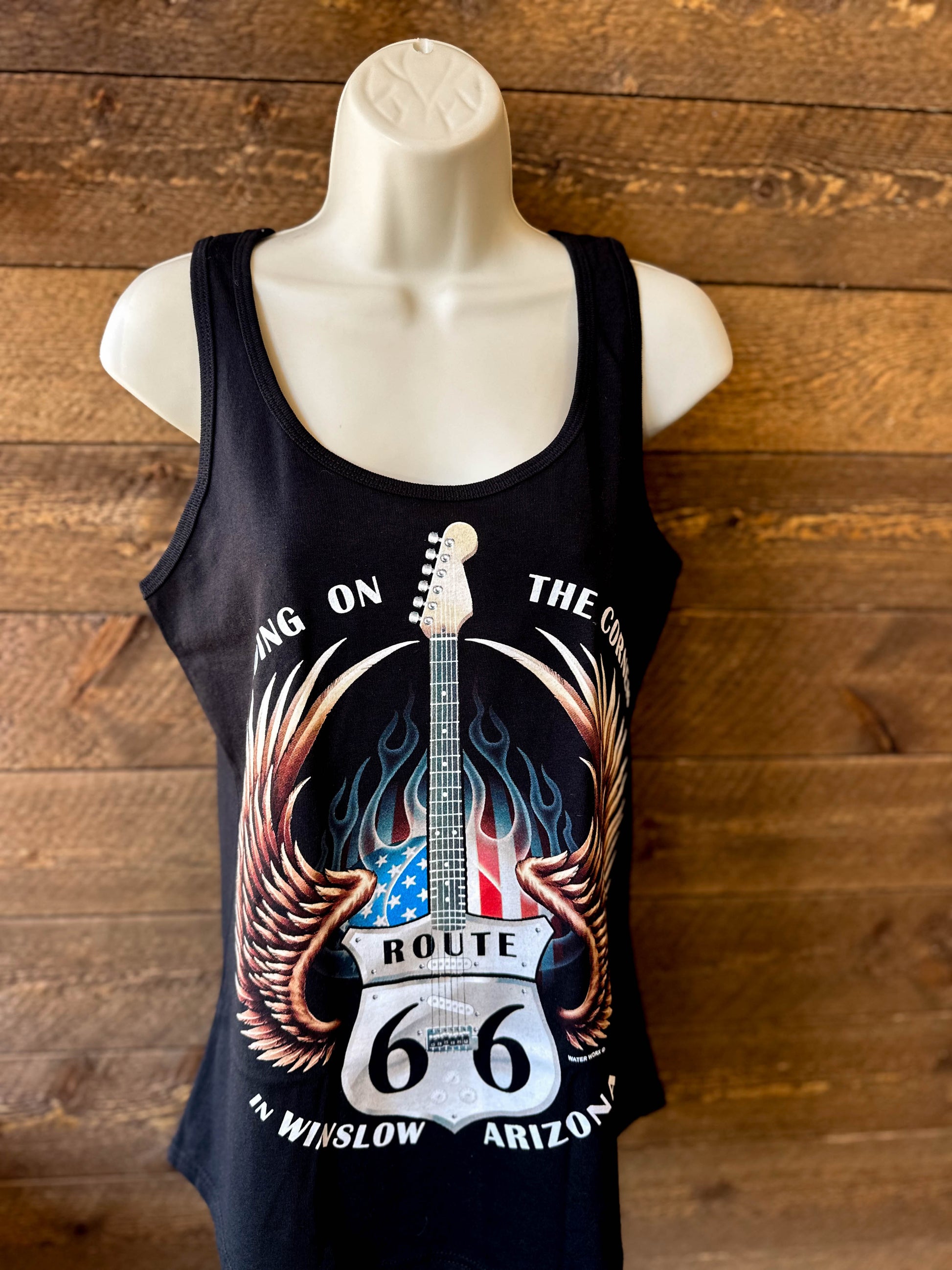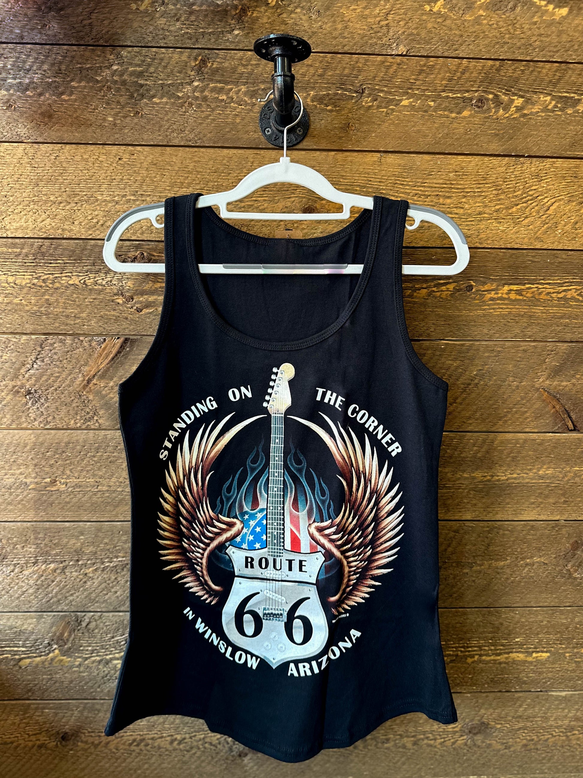 This tank is our original design done in house by the owner of our business. It's still our best seller to this day! The front says "Standin' on the corner in Winslow, Arizona" with the guitar wings design. The back is full of design and color, with a similar design but multi-colored with wings, flames, flag, shields... literally everything you could want in a tank. We are obsessed!