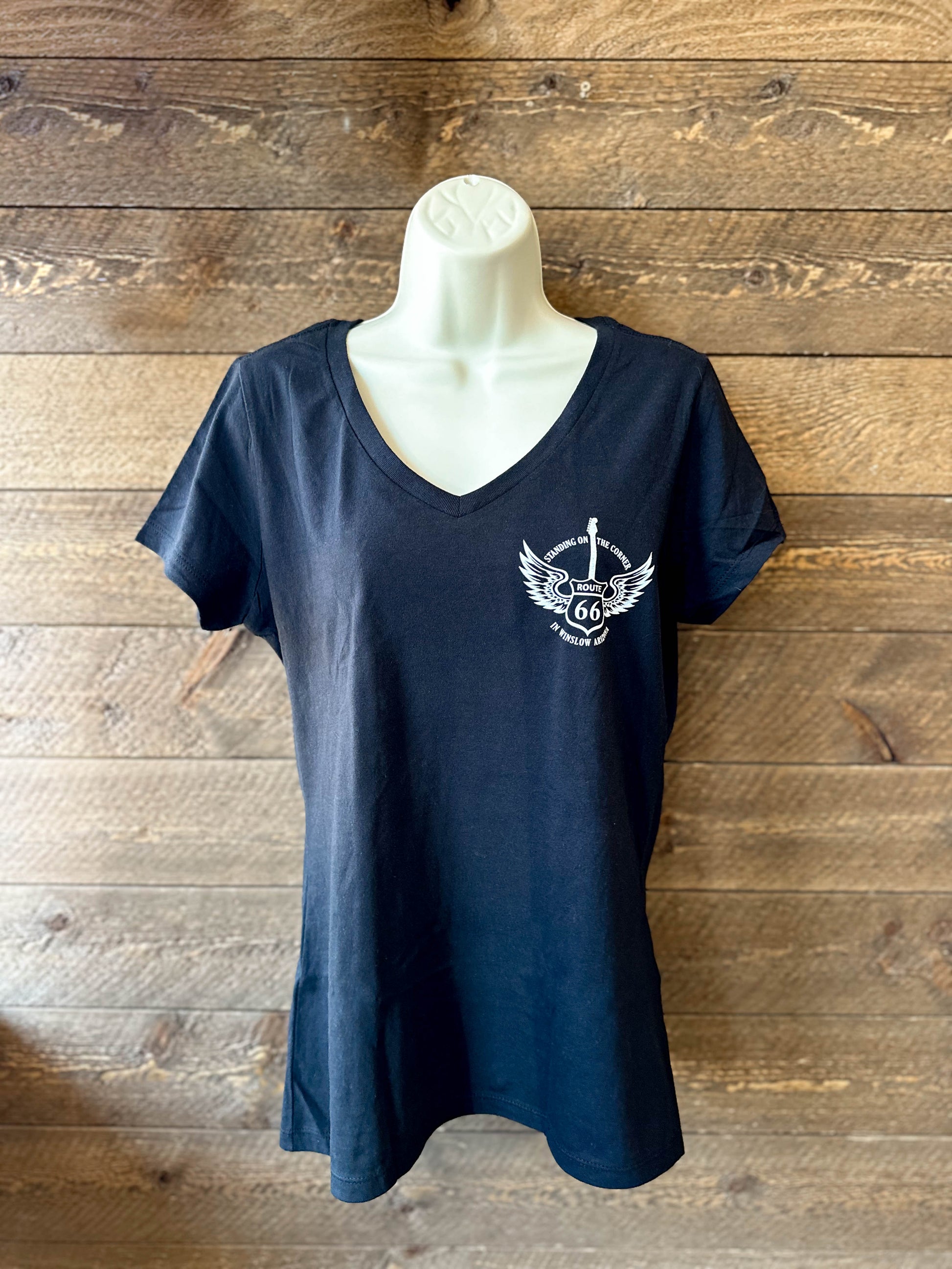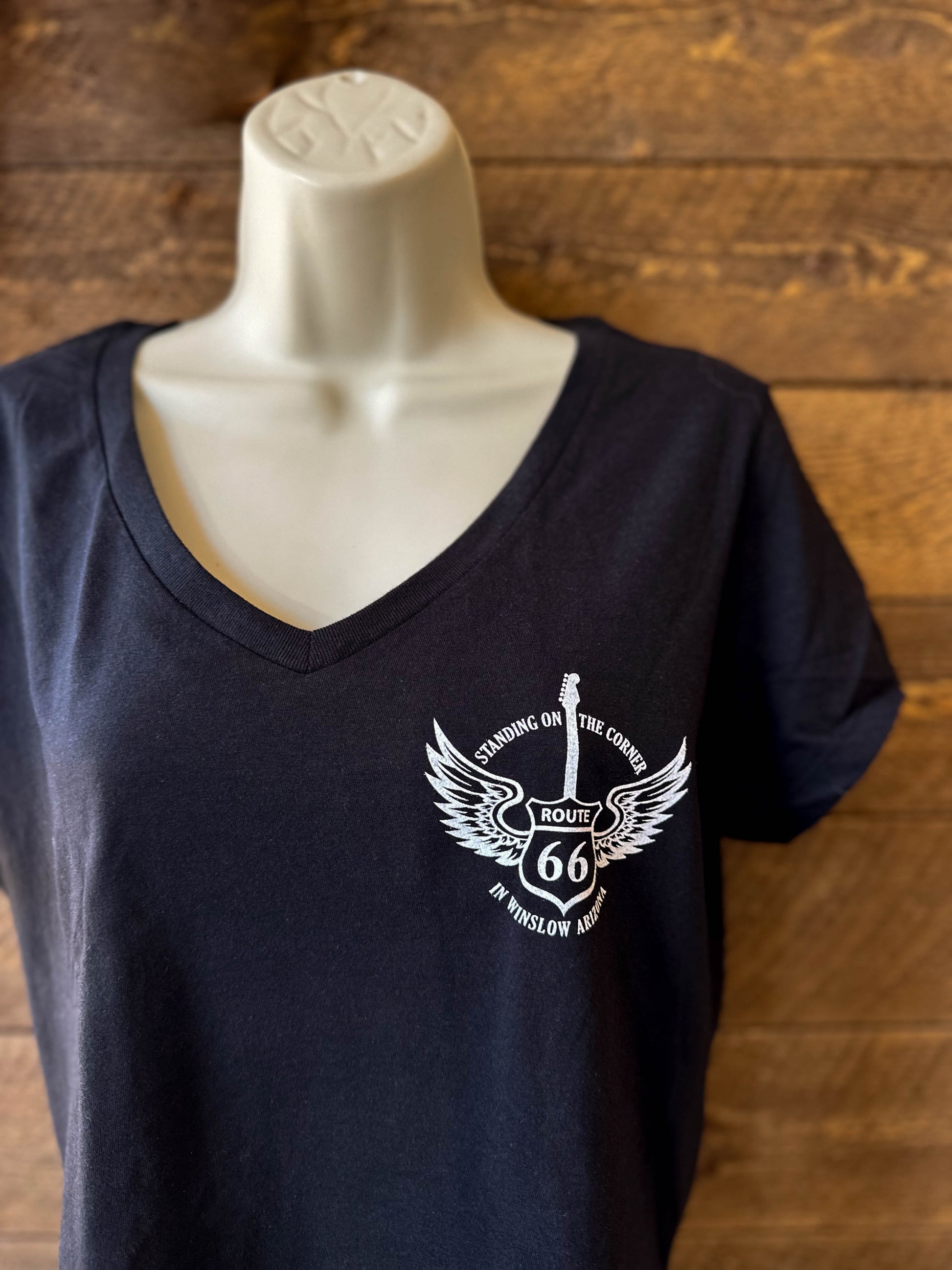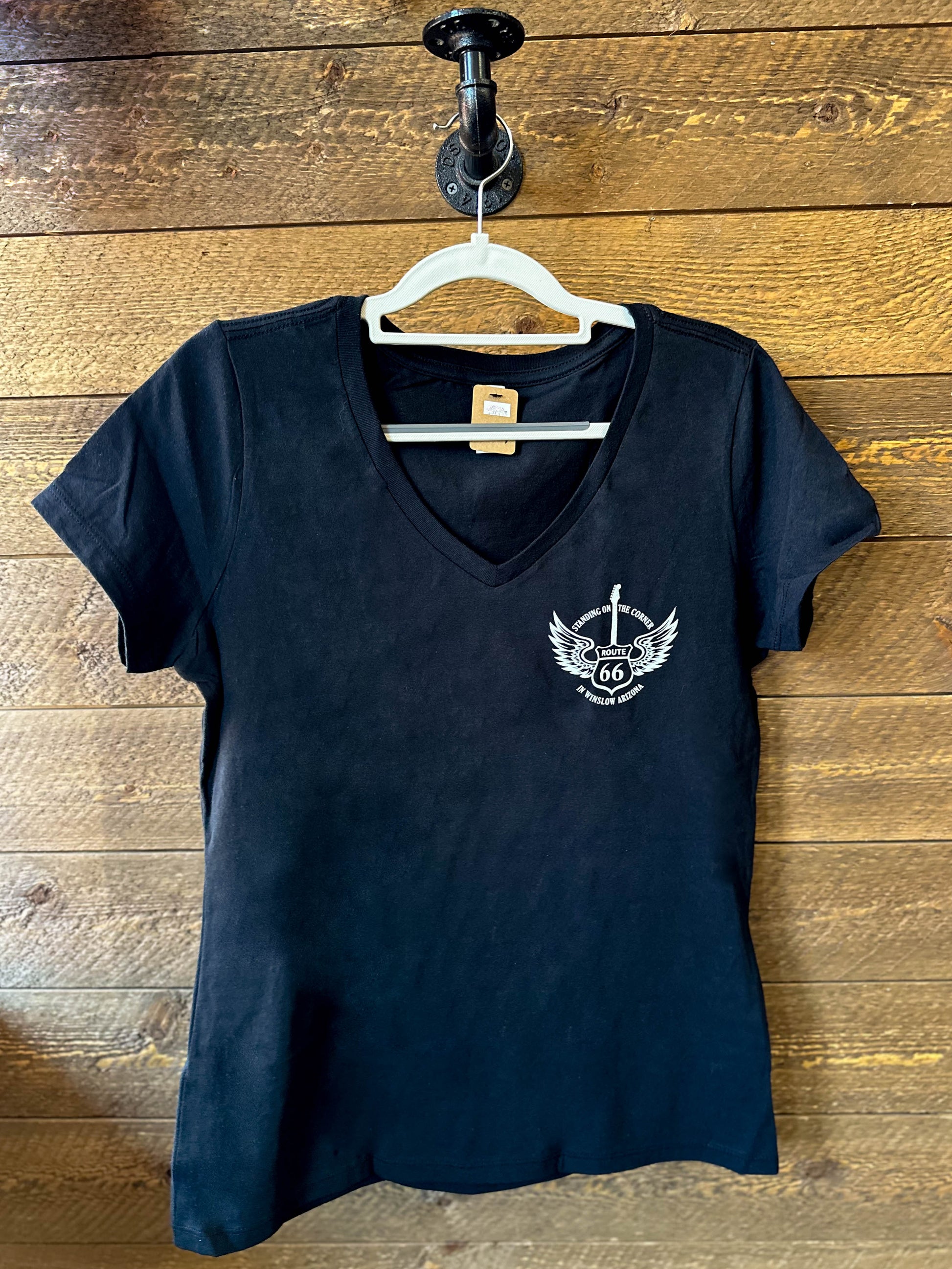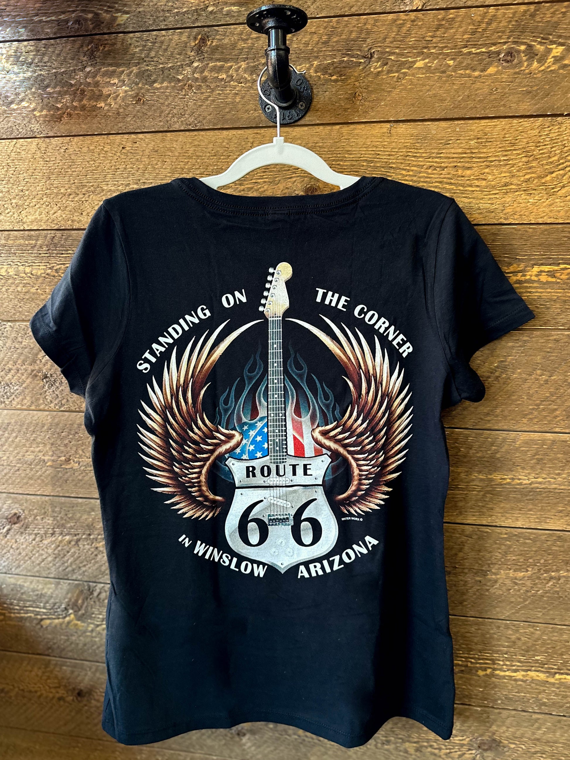 This tee is our original design done in house by the owner of our business. It's still our best seller to this day! The front says "Standin' on the corner in Winslow, Arizona" with the guitar wings design. The back is full of design and color, with a similar design but multi-colored with wings, flames, flag, shields... literally everything you could want in a Tee. We are obsessed!