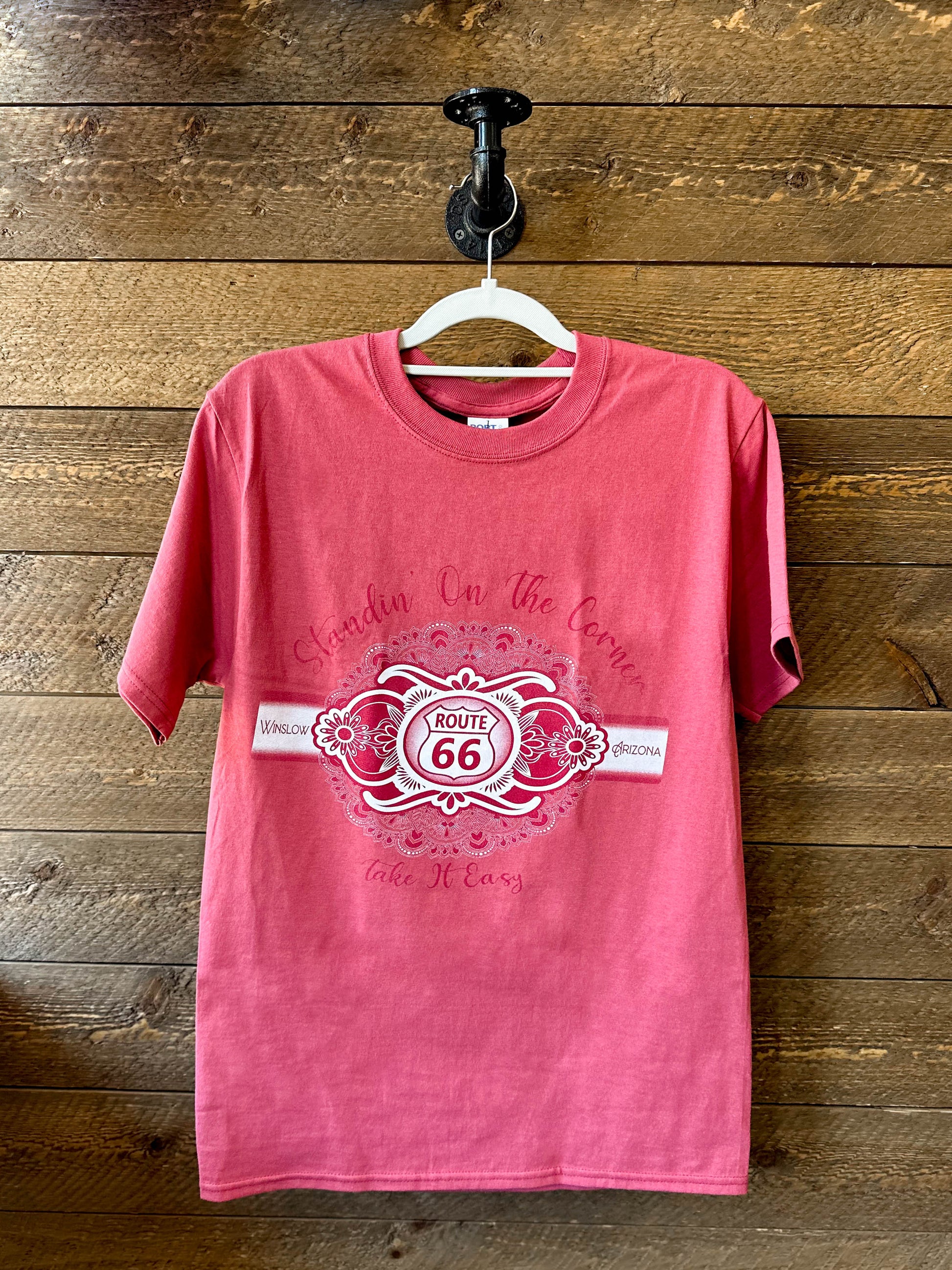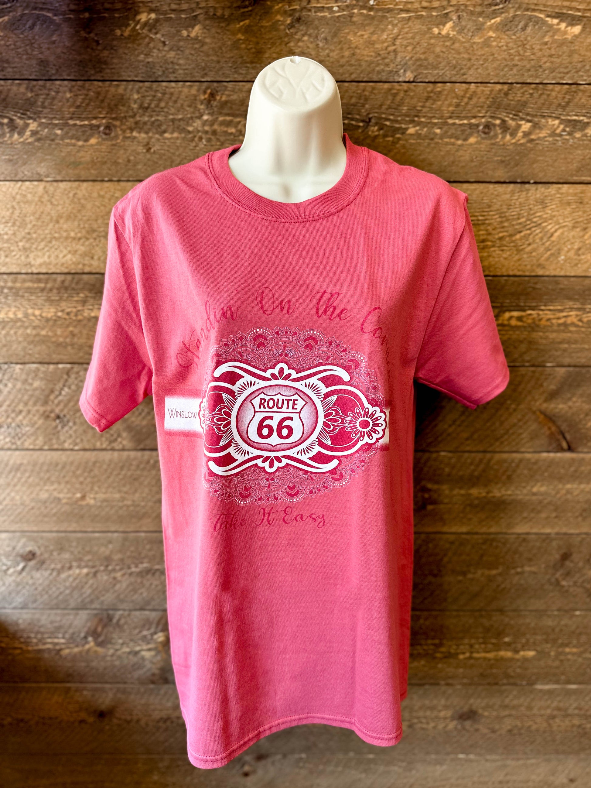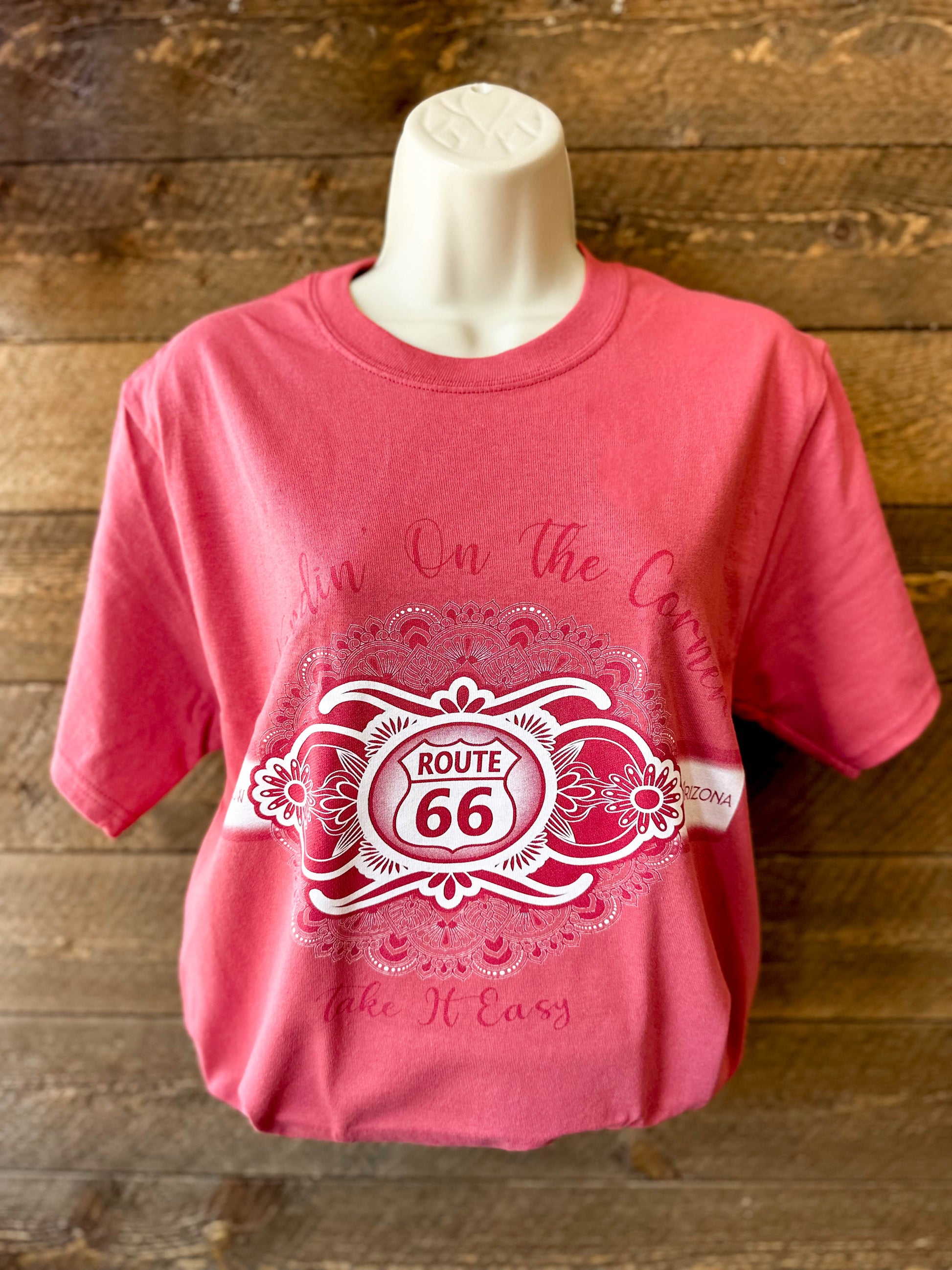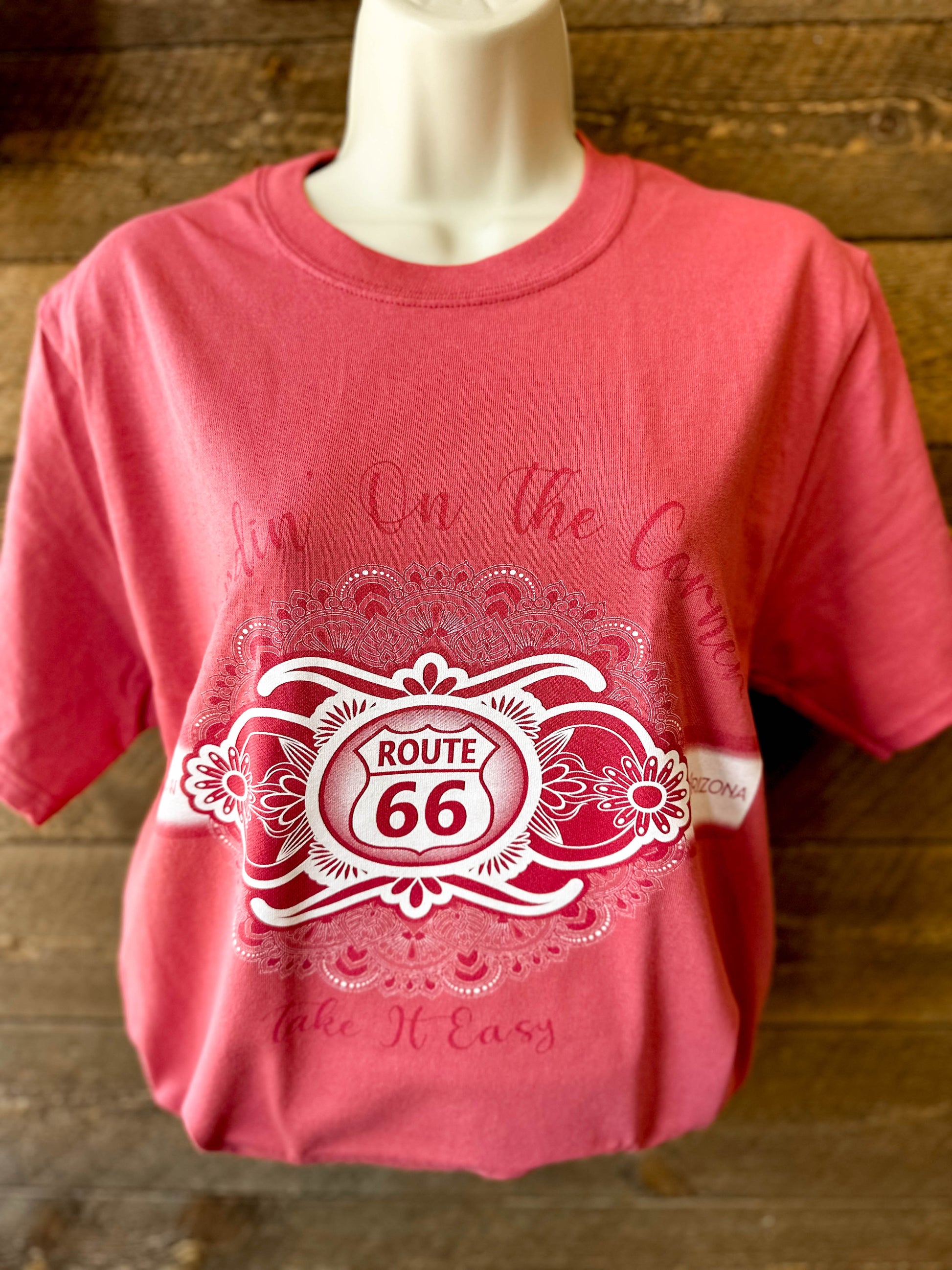 This tee has a henna style design featuring the Route 66 shield and our favorite "Standin' On the Corner" and "Take it Easy" phrases. It's completely designed and created in-house by our owner and printer, so it is complete one of a kind. We love this tee!