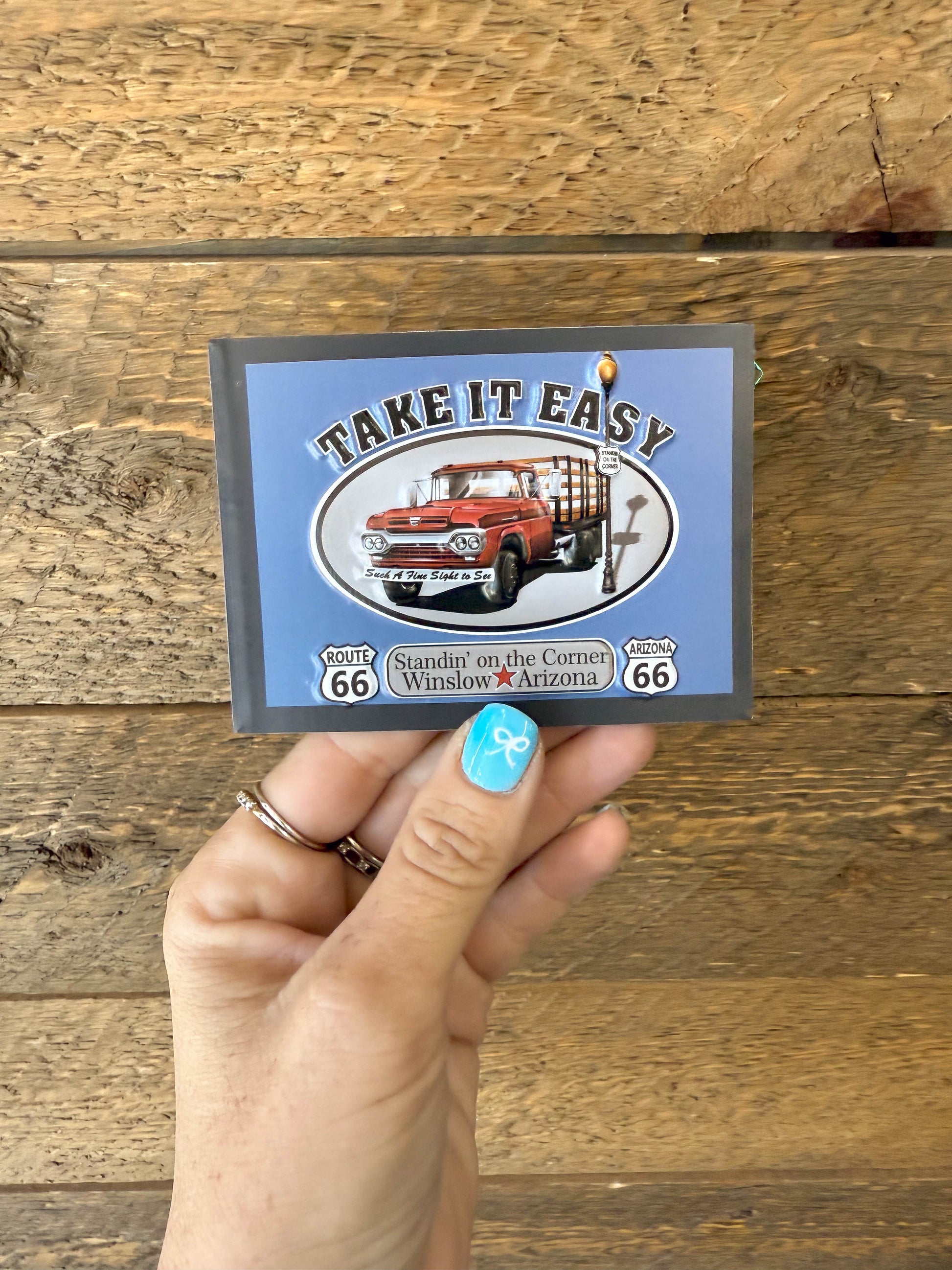 This is a magnet has the flatbed Ford image on it and is such a fun way to commemorate your time on the corner Taking it Easy!