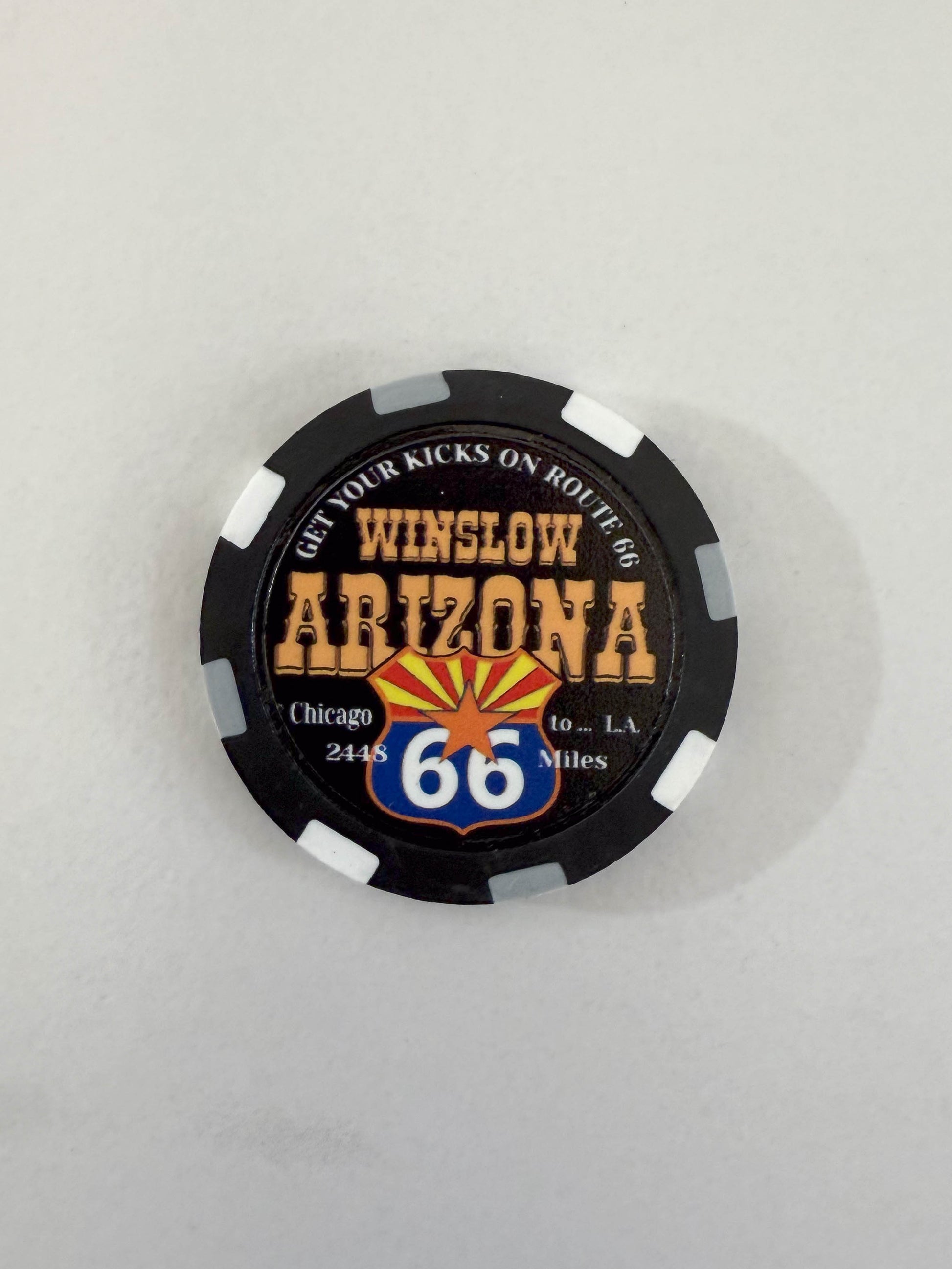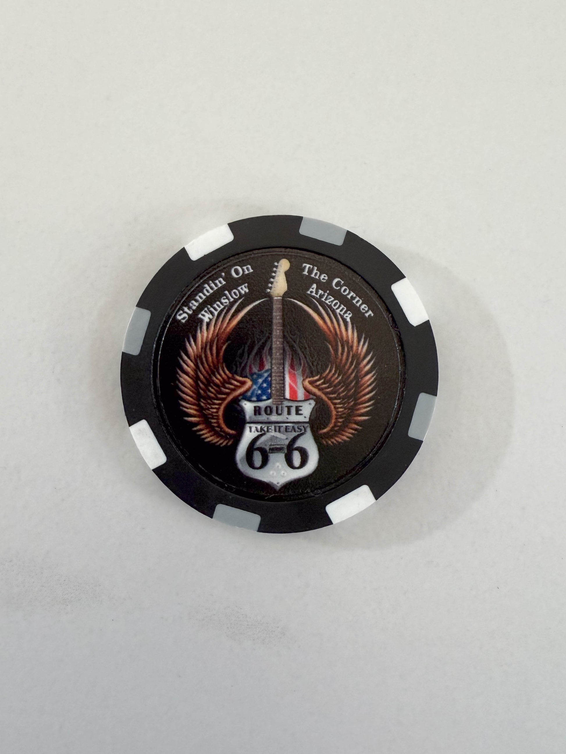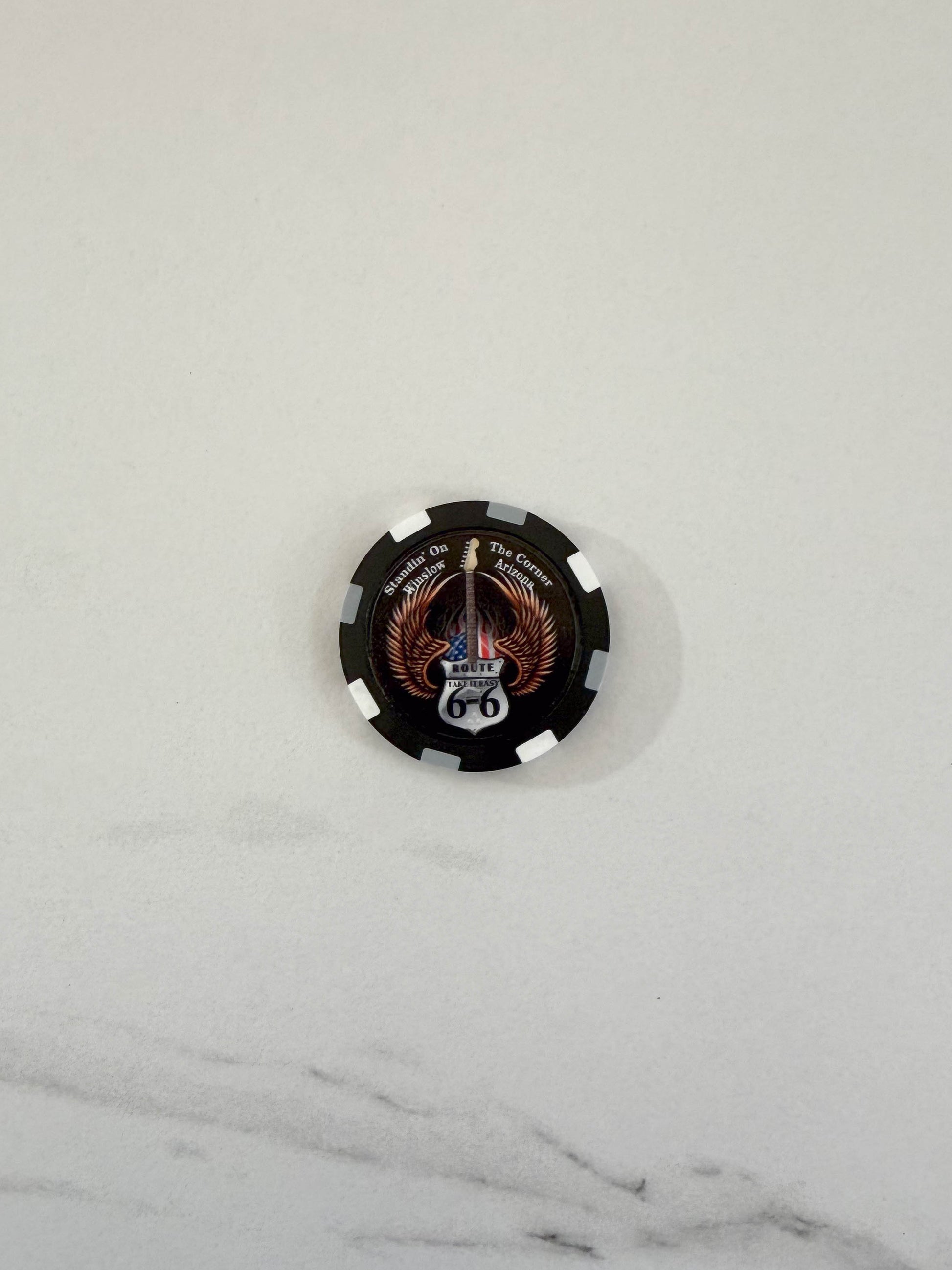 This little poker chip is a fun way to remember your time visiting the corner! It has our most popular wings and guitar design on one side, and a nod to this stop along Route 66 on the other side. We love it!