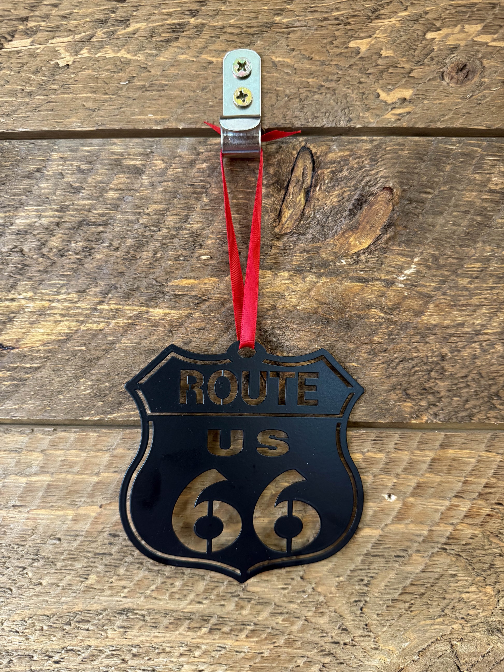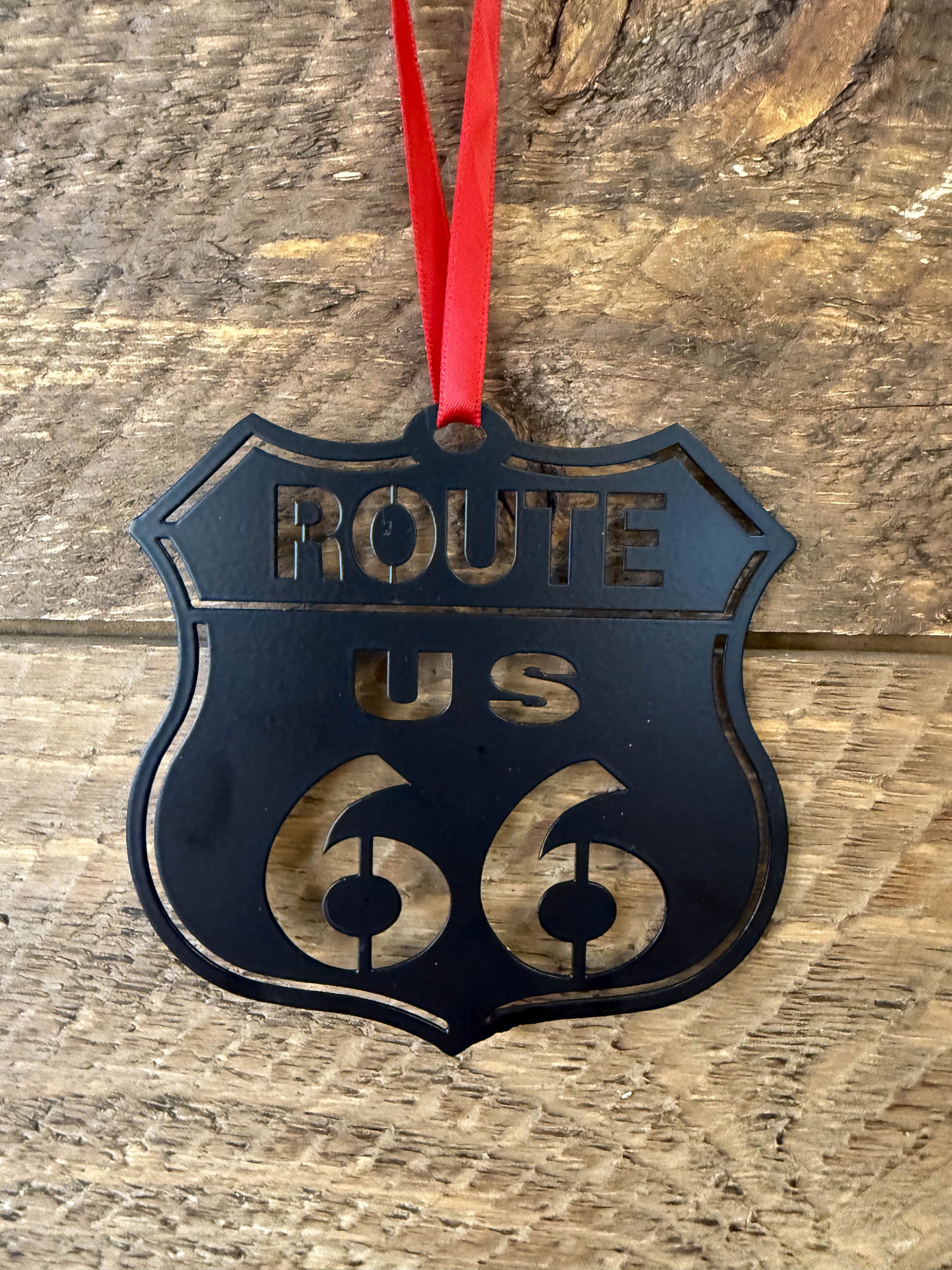Route 66 ornament made of black metal and tied up with red ribbon. It makes the perfect gift or chance to reminisce on your time visiting America's Favorite Highway.