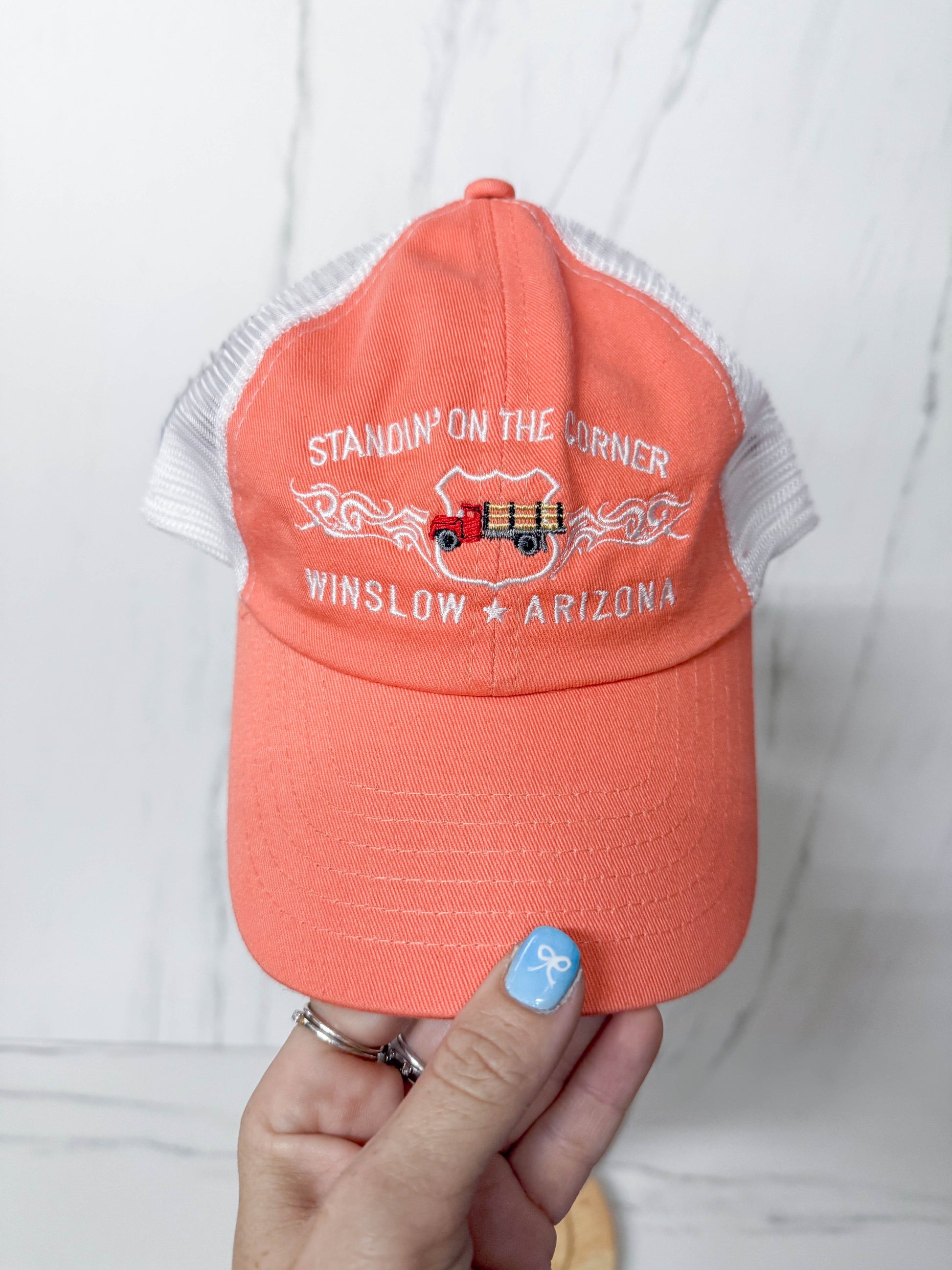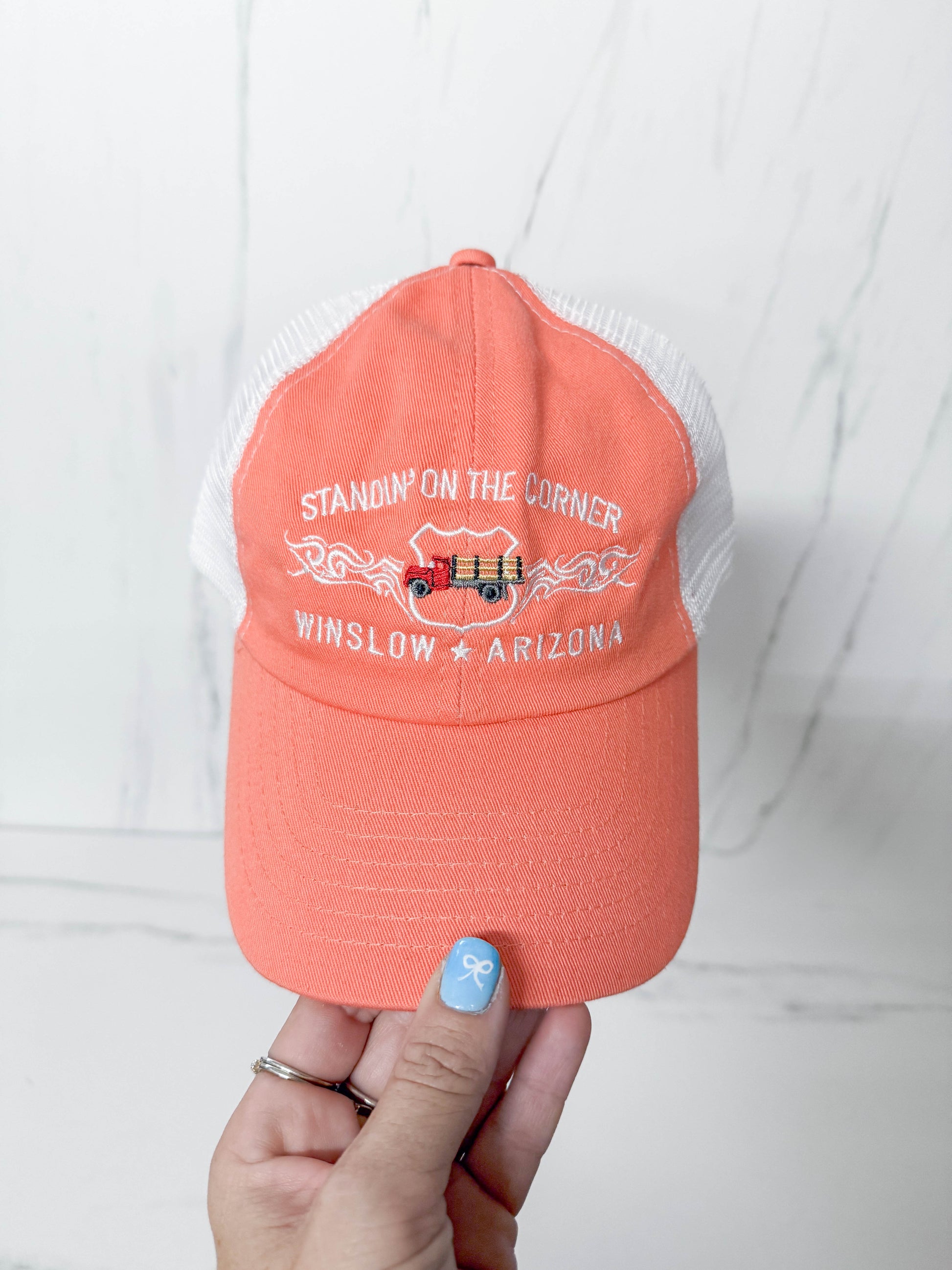 This cap is a fun and bright way to remember your time visiting the corner in Winslow, Arizona. It's a youth-sized cap and has an adjustable snap-back.