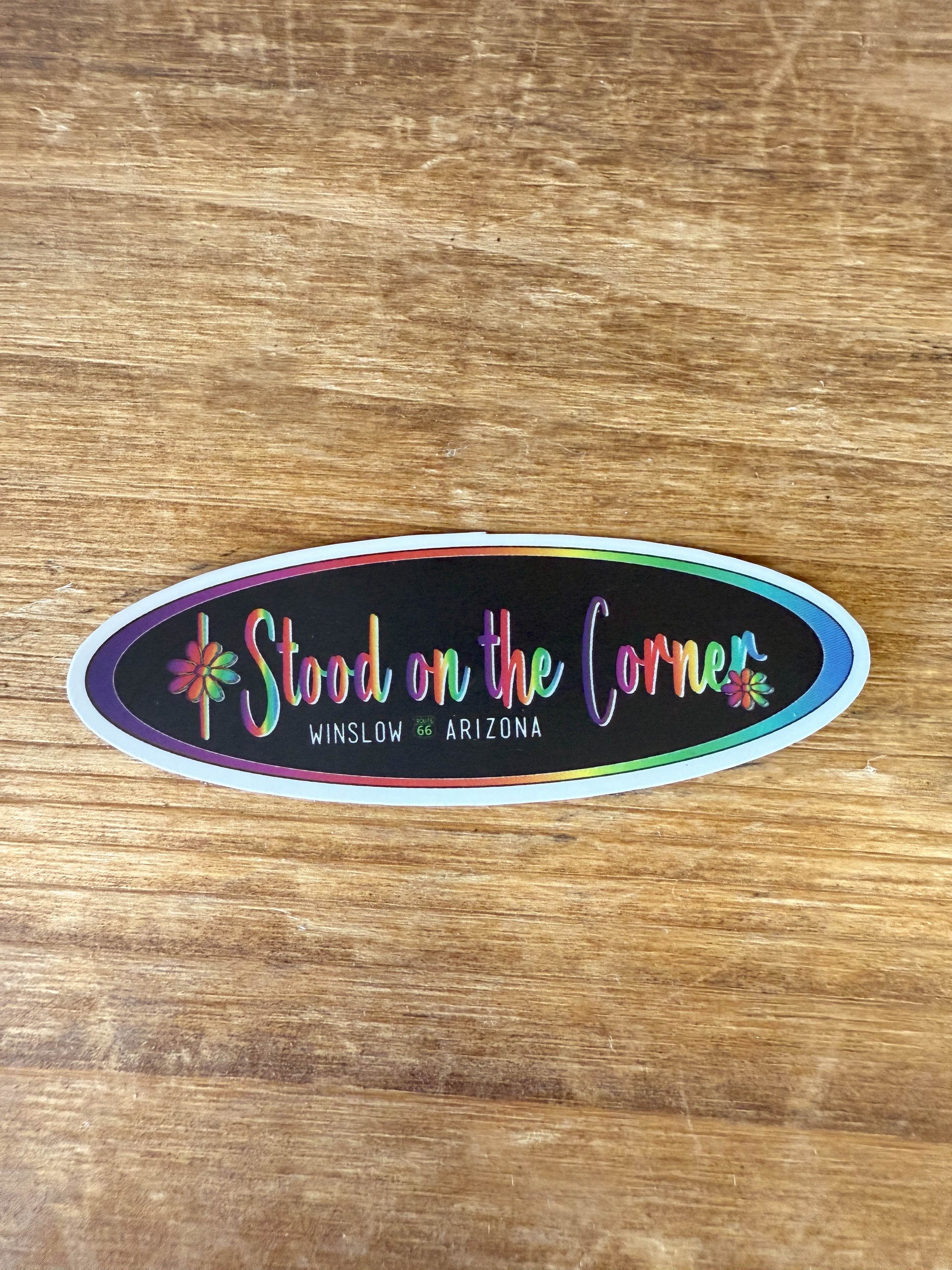 This sticker has "I stood on the Corner" in fun colors and a groovy font to commemorate your visit to the famous corner in Winslow, Arizona. This sticker measures approx. 3" across.
