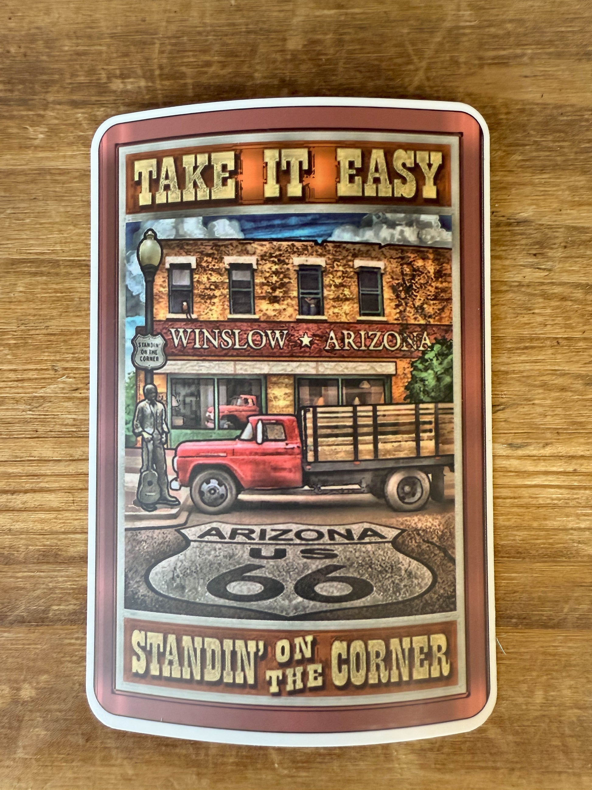 This sticker has a Standin' On The Corner on it as well as a photo of the corner in a cartoon variety to commemorate your visit to the famous corner in Winslow, Arizona. This sticker measures approx. 4.5" x 3".