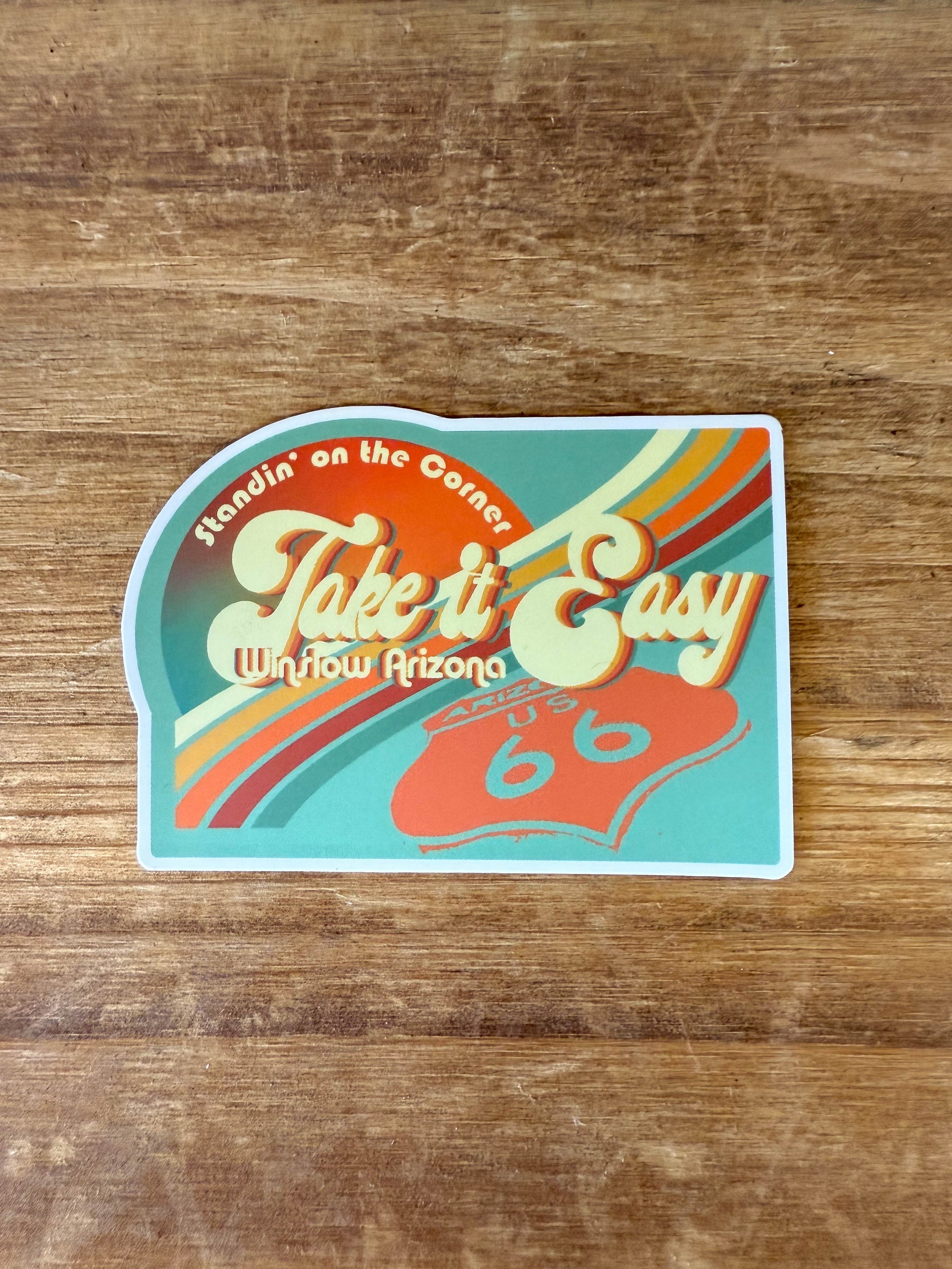This sticker has Take it Easy in fun colors and a groovy font to commemorate your visit to the famous corner in Winslow, Arizona. This sticker measures approx. 3" across.
