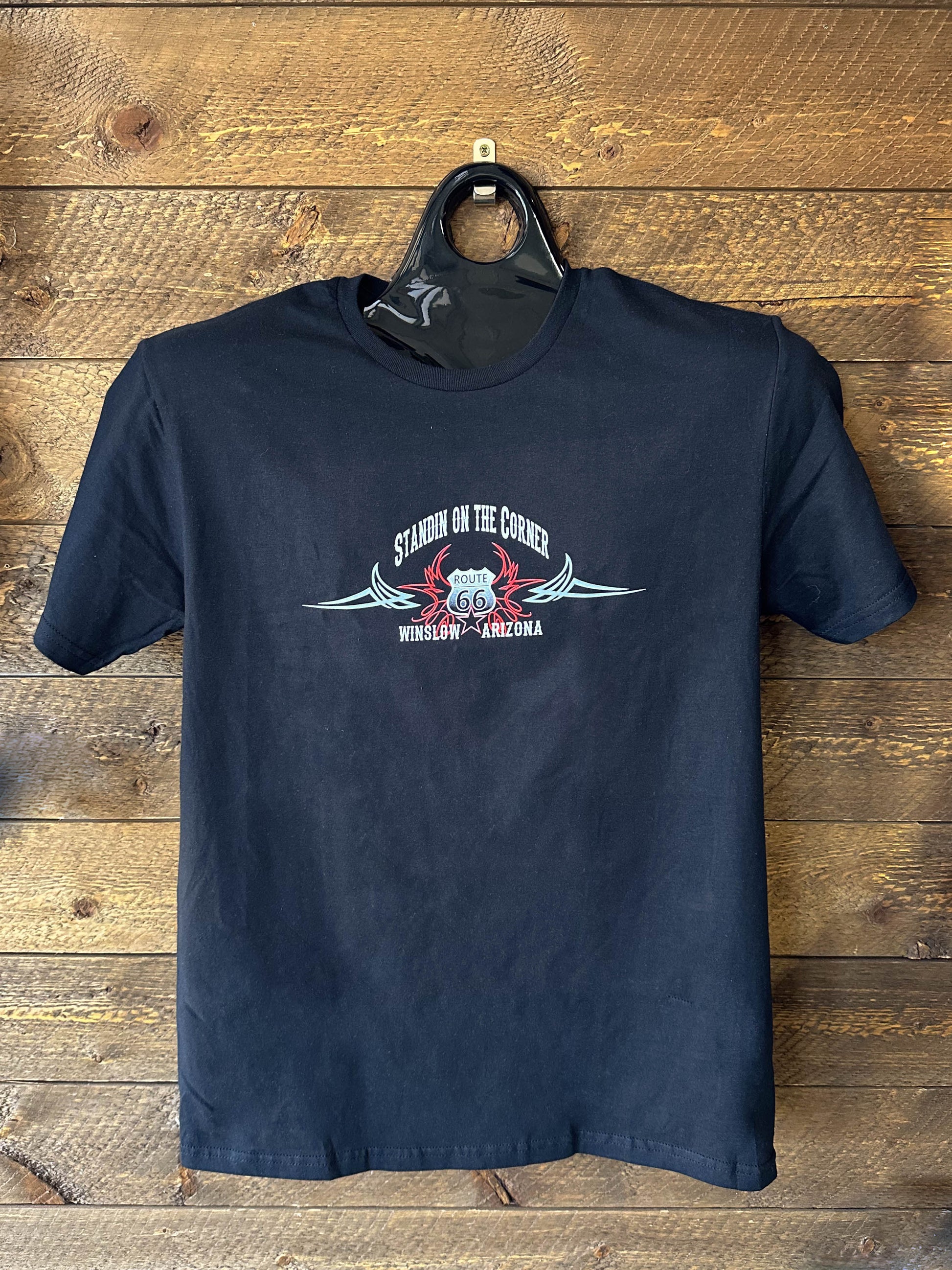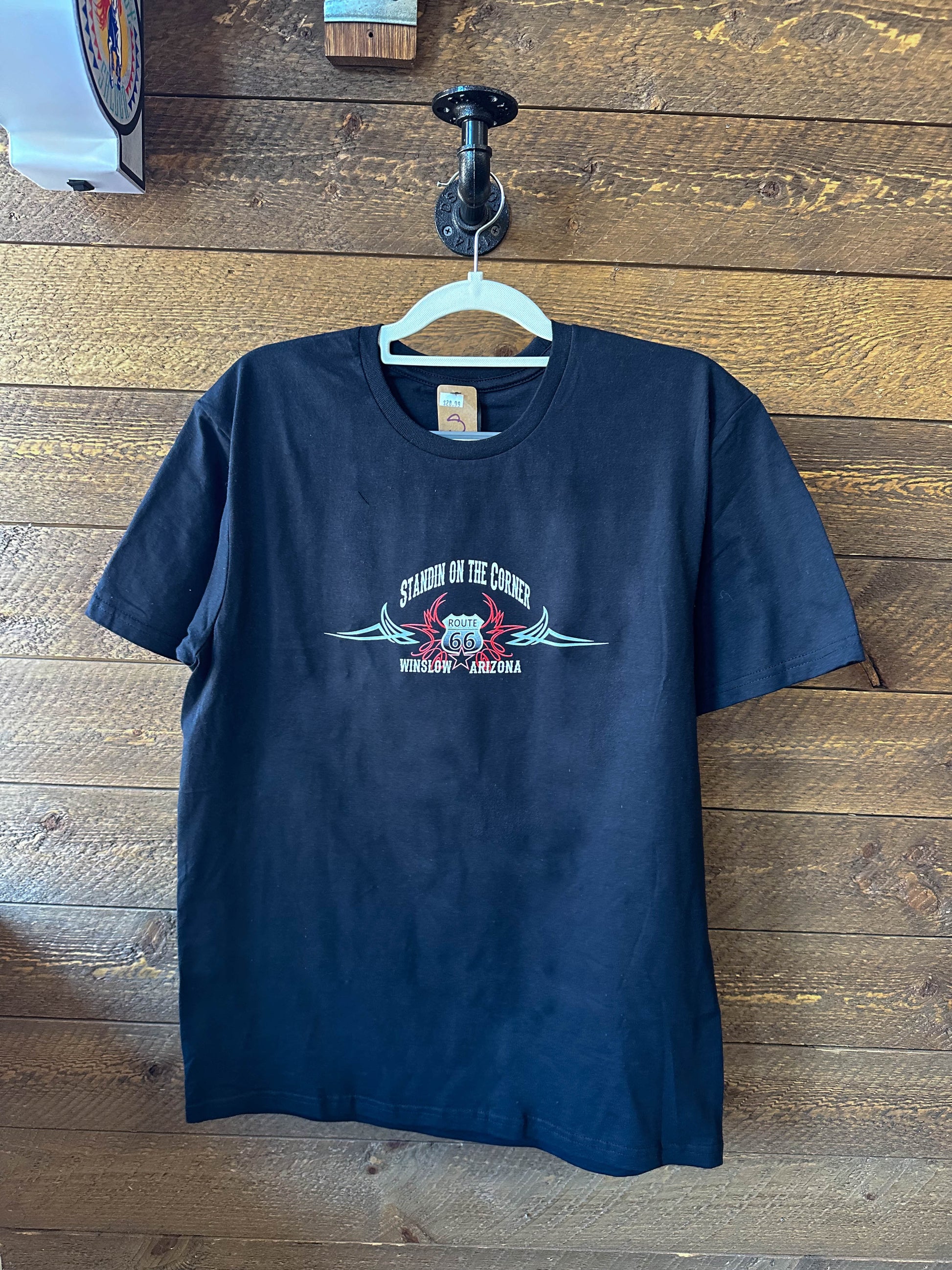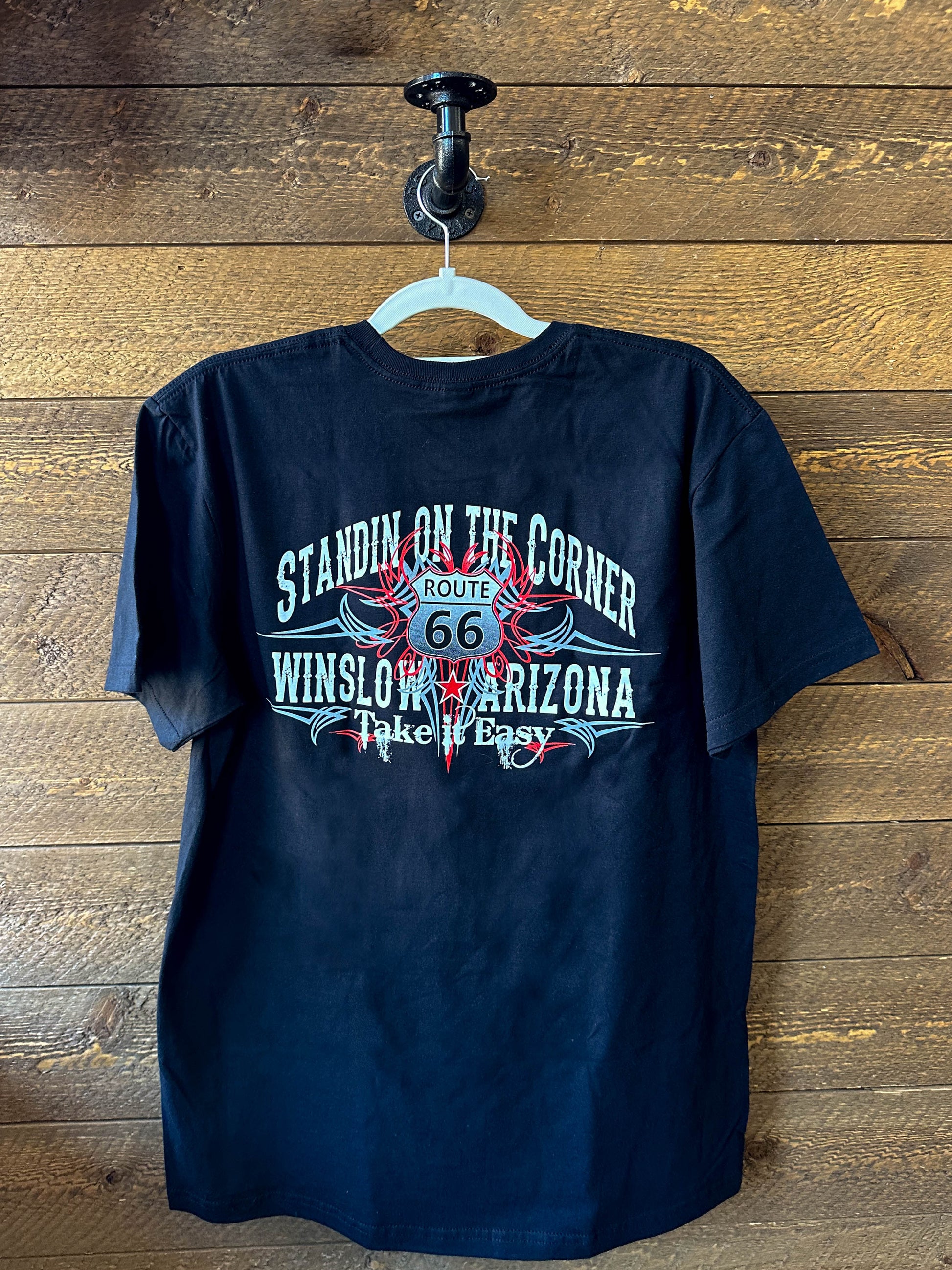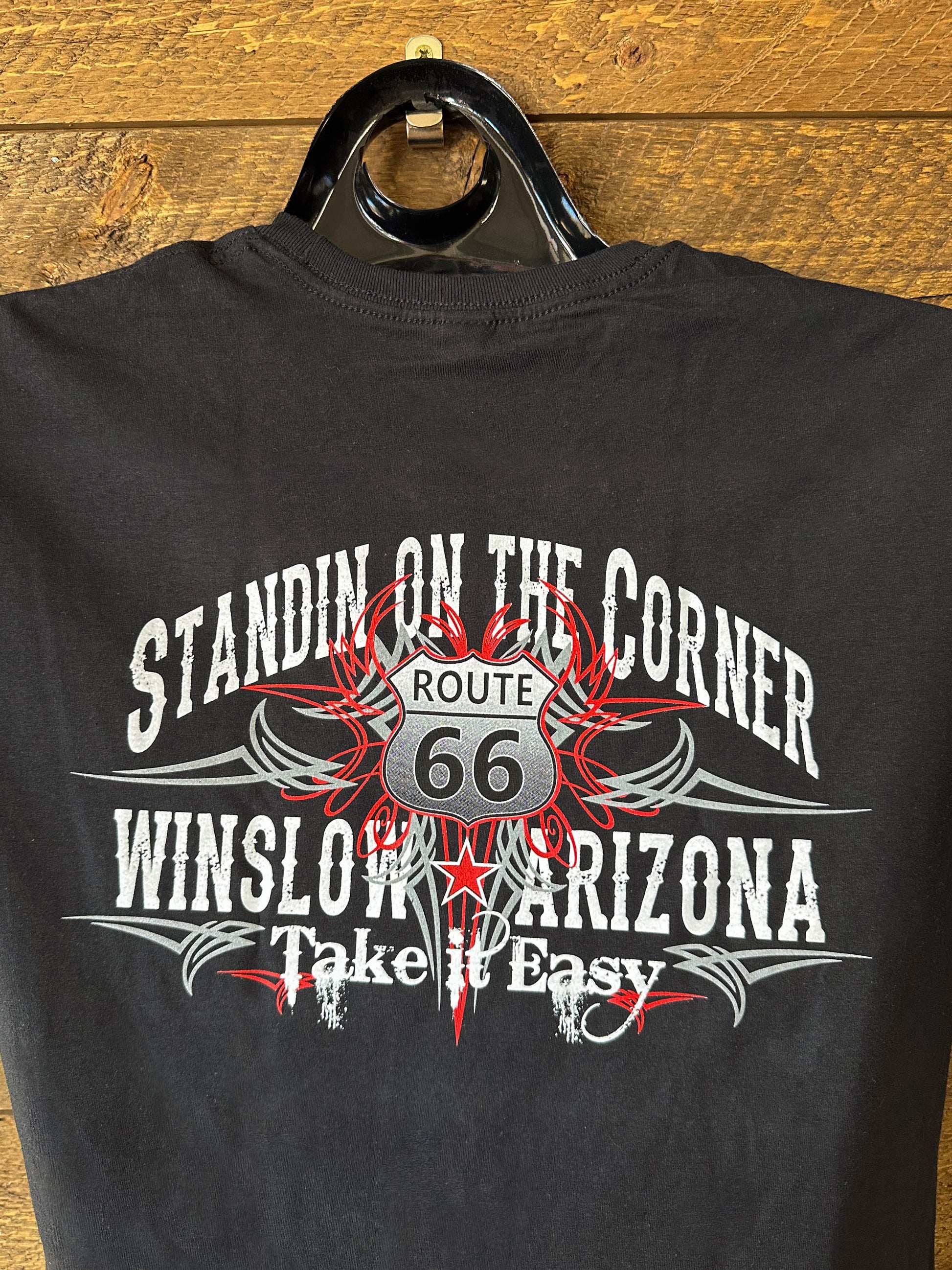 This black tee has "Standin' On the Corner", "Winslow * Arizona", and the Route 66 Shield with a neat imitation tattoo design on the front, with a similar design including "Take it Easy" on the back. This is one of our most popular designs, and is designed and created entirely in-house. It's completely one of a kind!
